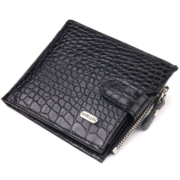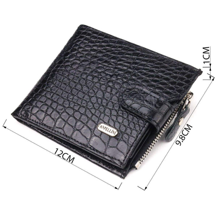 Оригінальний гаманець для чоловіків з натуральної фактурної шкіри з тисненням під крокодила. Аксесуар має одне основне відділення з перегородкою, до якого вміщуються купюри всіх номіналів, дев'ять кишень для карток, дві з яких під сіточкою, монетницю на блискавці, п'ять прилеглих кишень, а також автономний блок для карт, який розташований в одній із прилеглих кишень. Закривається аксесуар хлястиком на кнопку. Колір фурнітури – срібло. Шкіряний гаманець є чудовим подарунком для рідних та близьких людей.