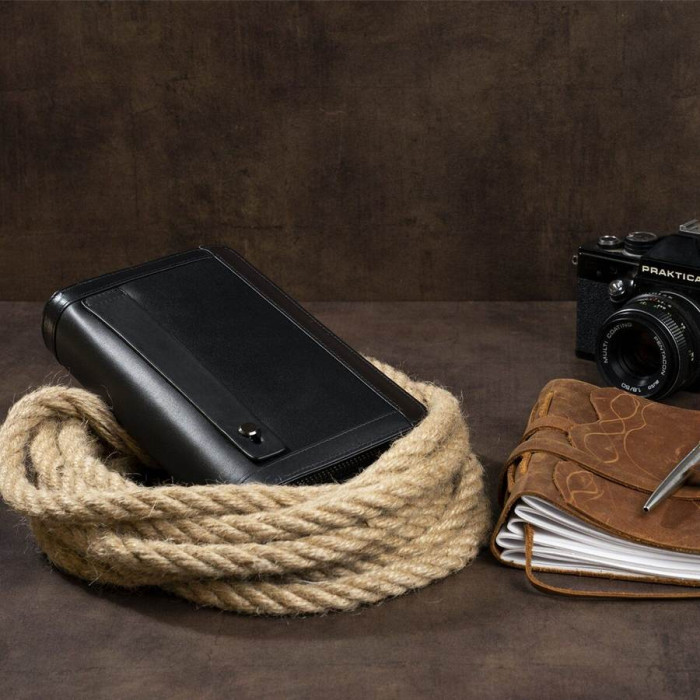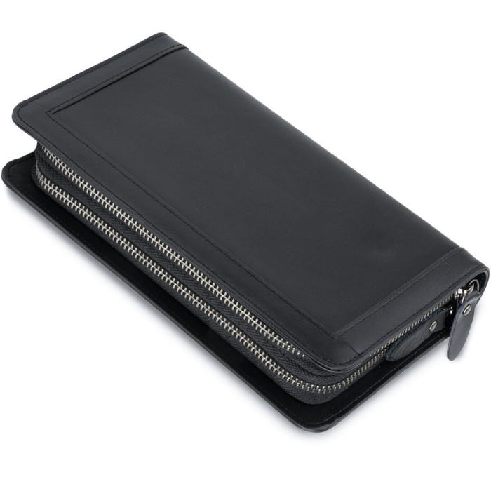 Зручний чоловічий клатч. Клатч поміщає в себе купюри, паспорт, кредитки, візитки. Особливістю моделі є, то що її можна носити на руці за допомогою спеціальної ручки. Аксесуар виконаний з гладкої шкіри високої якості і приємної на дотик. З таким клатчем ви проходите далеко не один рік. Дуже комфортний у використанні. По краях аксесуар прошитий міцною чорною ниткою. Модель упакована в тканинний чохол, що захищає його від пилу і зручний для зберігання.