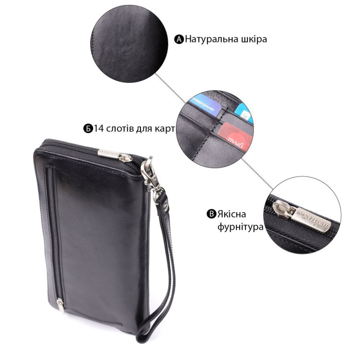 – усередині: три відділення для купюр, кишеня на блискавці та 14 осередків для карток;
