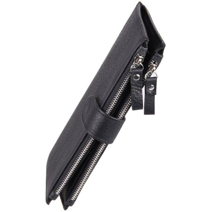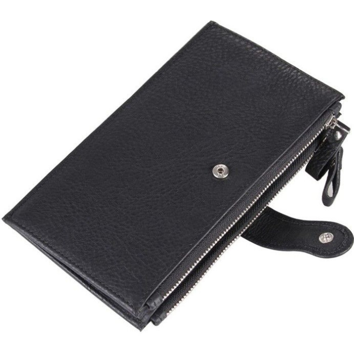 Закривається за допомогою хлястика на кнопці, при відкритті його на верхніх гранях розміщено два відділення на змійках. Їх можна використовувати для купюр і габаритного смартфона до 5,5 дюймів (потрібно врахувати габарити корпусу).