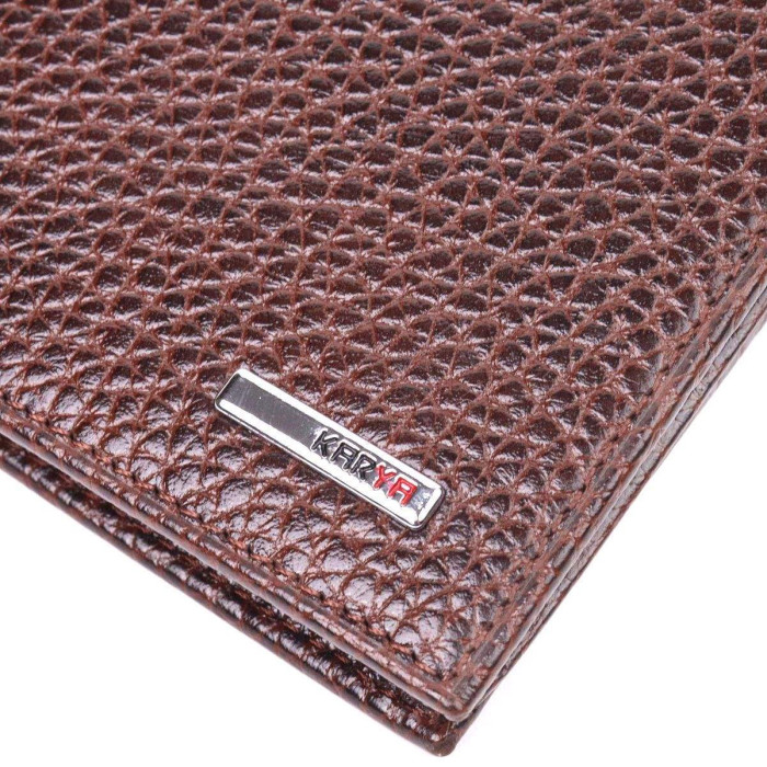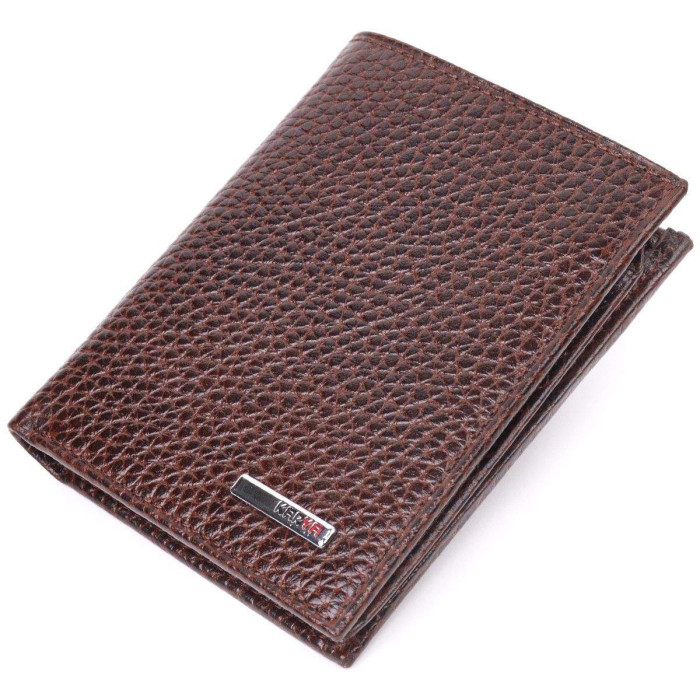 Практичний портмоне з крупнозернистої натуральної шкіри в сучасному дизайні та красивому коричневому кольорі. Такий аксесуар оцінять любителі натуральних та якісних речей, виріб виконаний з натуральної шкіри високої якості. Портмоне має містке відділення для купюр, слоти для пластикових карток та монетницю. Цей аксесуар чудово підійде як подарунок і принесе виняткову радість близькій людині.