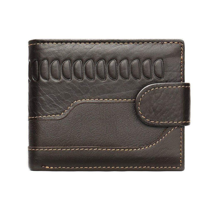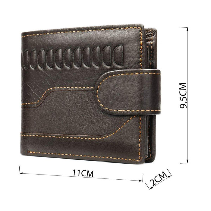 Функціональний та стильний гаманець для чоловіків з тисненням. Аксесуар з натуральної шкіри. Компактний гаманець легко поміститься в вашу сумку або кишеню. По краях модель прошита світлою ниткою. Виріб закривається на шкіряний хлястик з кнопкою. Гаманець прекрасно підійде на подарунок для чоловіків.