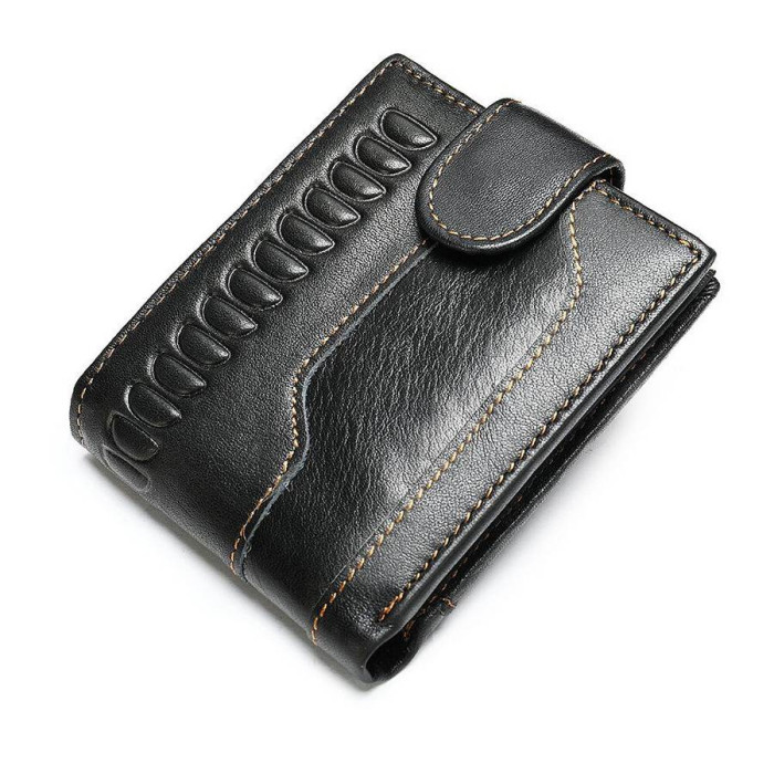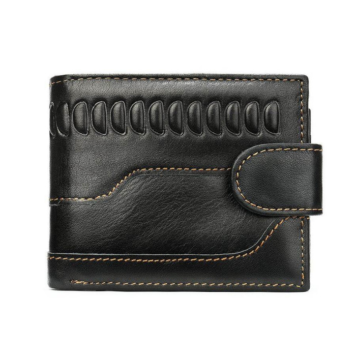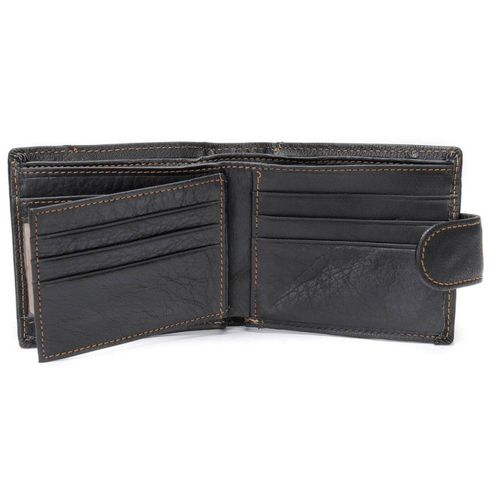 Функціональний та стильний гаманець для чоловіків з тисненням. Аксесуар з натуральної шкіри. Компактний гаманець легко поміститься в вашу сумку або кишеню. По краях модель прошита світлою ниткою. Виріб закривається на шкіряний хлястик з кнопкою. Гаманець прекрасно підійде на подарунок для чоловіків.