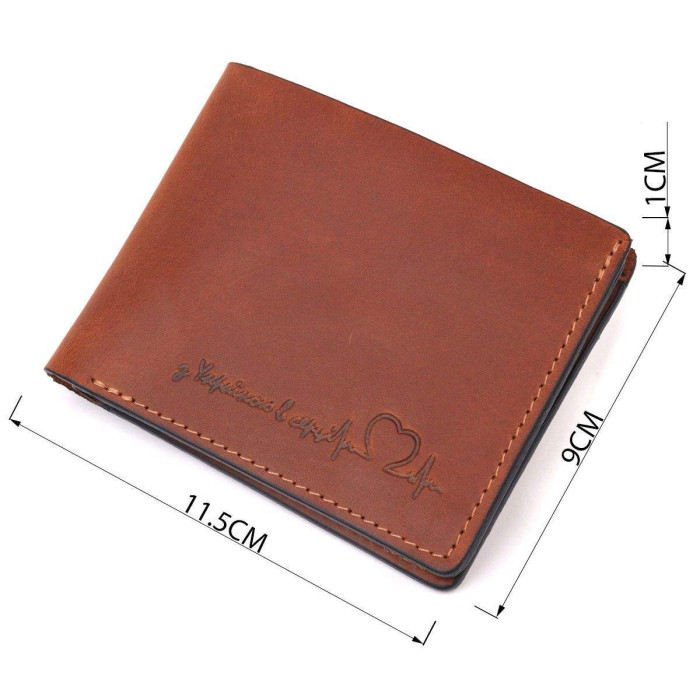 Надійний шкіряний гаманець світло-коричневого кольору з патріотичним написом “З Україною в серці”. Виріб пошитий із якісної шкіри, з високими показниками зносостійкості. Портмоне має одне велике відділення для купюр усіх номіналів, а також достатню кількість відділень для карток, без застібки. Шкіряний гаманець стане чудовим подарунком на всі свята для коханих та близьких.