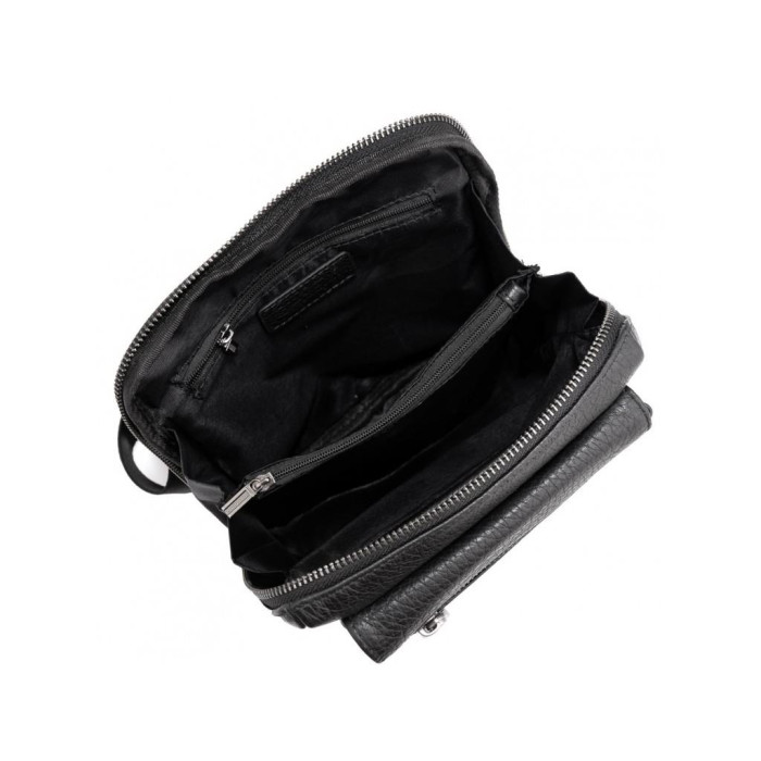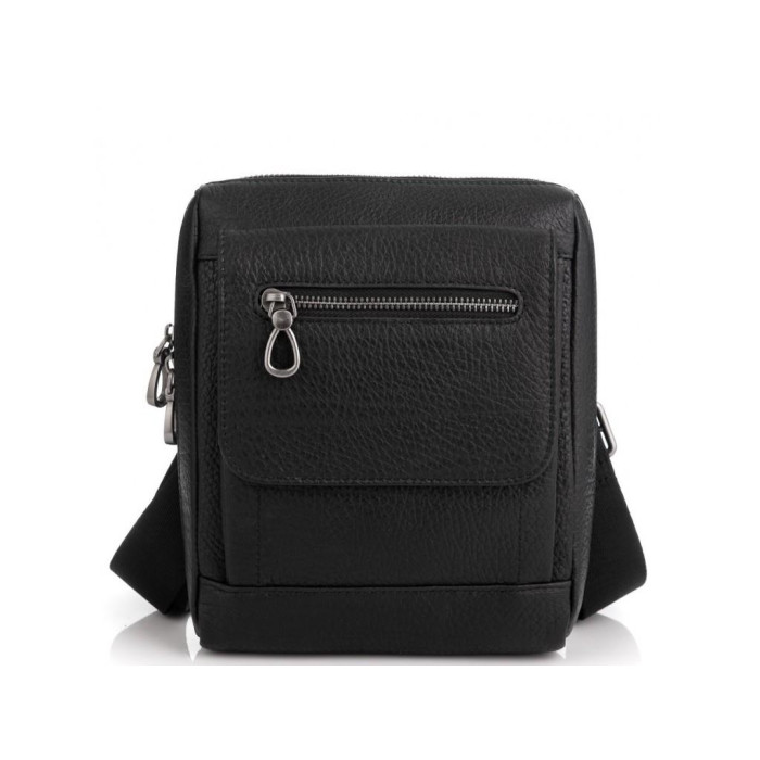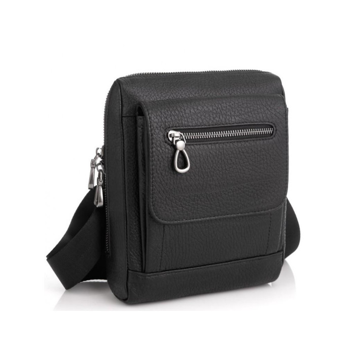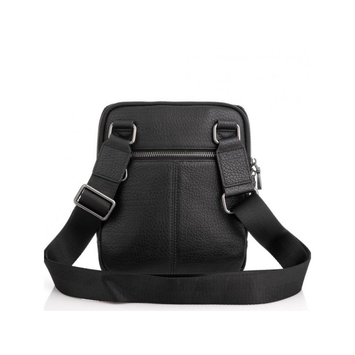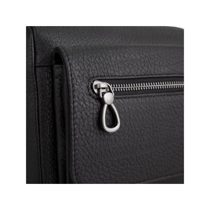 Сумка має чорний колір. Плечовий ремінь регулюється по довжині, фурнітура темно-срібна, пуллери - металеві. Чоловіча сумка оснащена одним основним відділенням, всередині якого є кишеня-перегородка на блискавці, а також кишеня відкритого типу і маленька кишеня на блискавці для дрібниць. З лицьового боку накладний клапан на прихованій магнітній кнопці, на ньому розташована маленька кишеня на блискавці. З тильного боку кишеня на блискавці горизонтального типу.