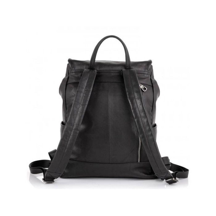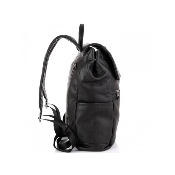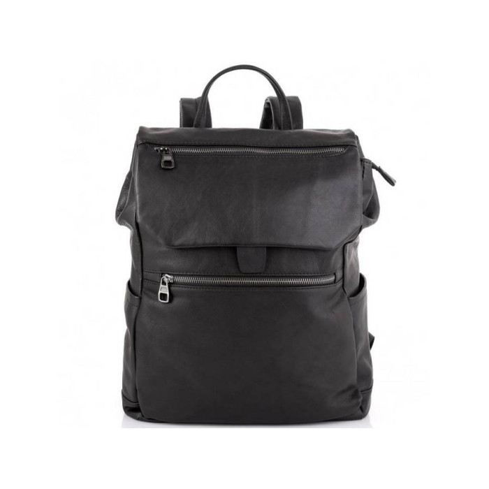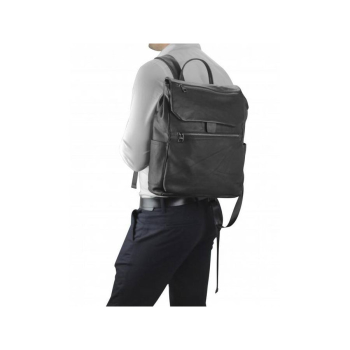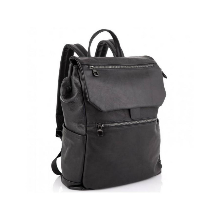 Чоловічий рюкзак в чорному кольорі. Має стильний зовнішній вигляд і виготовлений з м'якої на дотик шкіри. Плечові ремені регулюються по довжині, також для носіння можна використовувати шкіряну ручку. Є одне основне відділення на блискавці, яке накривається клапаном на магнітах. З лицьового боку є дві кишені на блискавці, одна знаходиться на клапані з тильного боку кишеня на блискавці вертикального типу. З боків рюкзака дві маленькі кишені відкритого типу. Всередині є відділення для планшета або ноутбука на липучці, одна кишеня на блискавці і дві кишені відкритого типу.