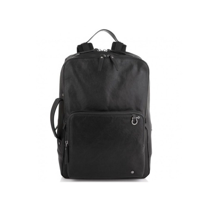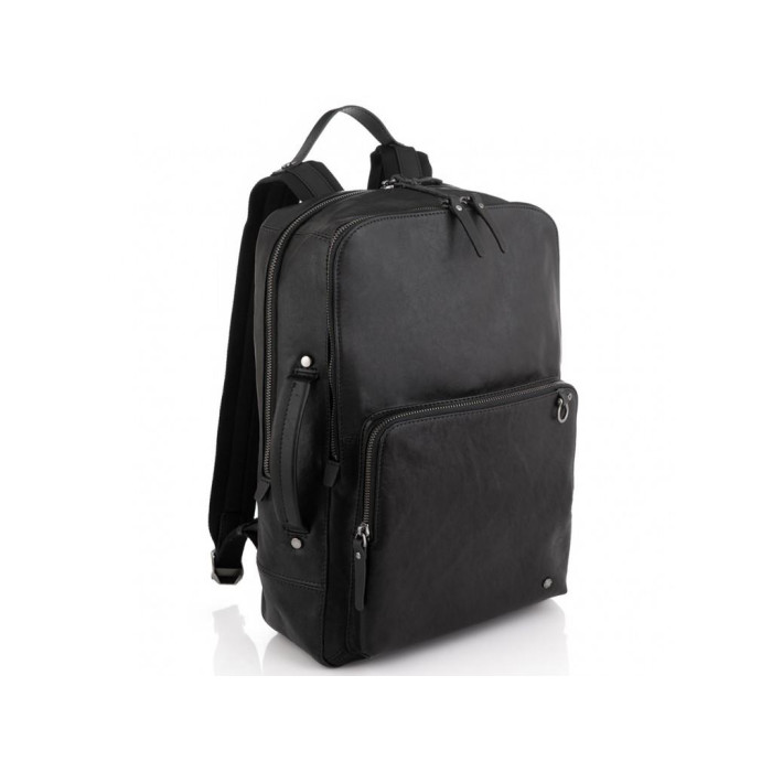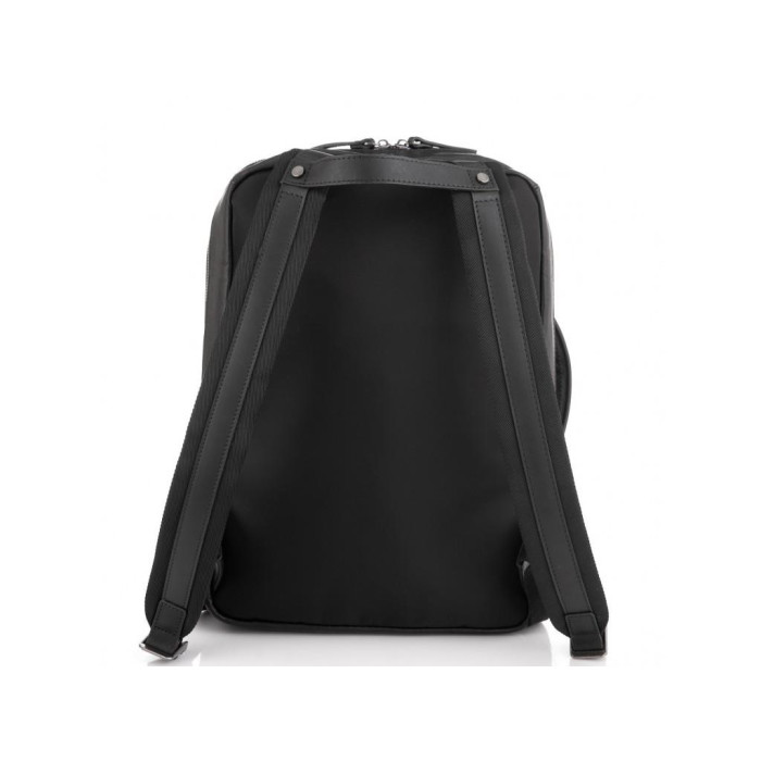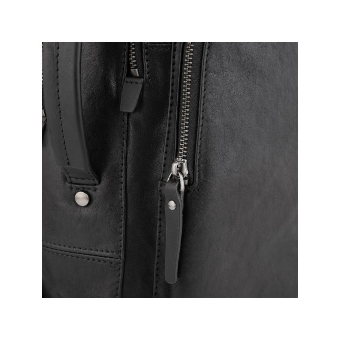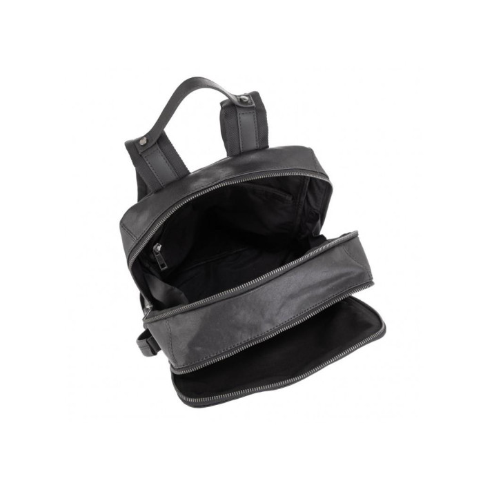 Шкіряний чорний рюкзак в гладкій шкірі. Для перенесення є наплічні шлейки, шкіряна ручка зверху рюкзака, а також шкіряна ручка з боку на рюкзаку. Наплічні шлейки текстильні зі шкіряною смужкою, спинка рюкзака текстильна. Чоловічий рюкзак має одне основне велике відділення всередині якого є кишеня на блискавці, а також дві кишені відкритого типу. Також є велика кишеня на блискавці і ще одна накладна кишеня на блискавці.