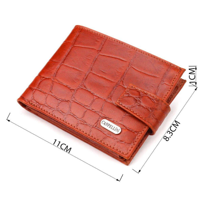 Красиве чоловіче портмоне з натуральної фактурної шкіри з тисненням під крокодила. Аксесуар має одне основне відділення з перегородкою, в якому розміщуються купюри всіх номіналів, дванадцять кишень для карток, чотири з яких під сіточкою. Закривається аксесуар хлястиком на кнопку. Колір фурнітури – срібло. Ви легко зможете помістити його в кишеню штанів чи маленьку сумку. Запакований гаманець картонну коробку. Шкіряний гаманець є чудовим подарунком для рідних та близьких людей.