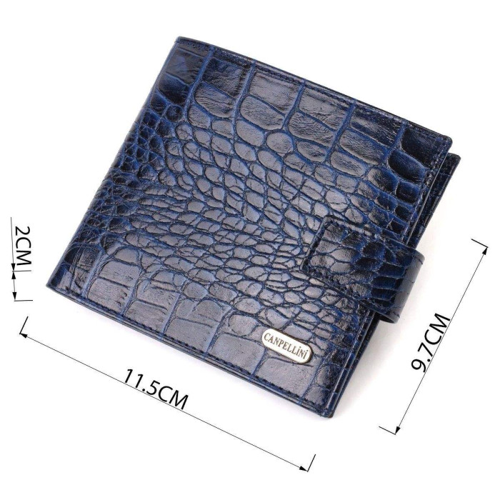 Стильний чоловічий гаманець із натуральної фактурної шкіри із тисненням під крокодила. Аксесуар має основне відділення для купюр, три осередки для карток, дві кишені під сіточкою, кишеню на блискавці через усю довжину та монетницю, що закривається клапаном на кнопку. Гаманець складається навпіл і закривається хлястиком на кнопку. На лицьовій стороні в правому нижньому кутку розташований металевий логотип компанії виробника. Багатофункціональний чоловічий гаманець з дуже міцної шкіри чудовий вибір подарунка для солідного чоловіка.
