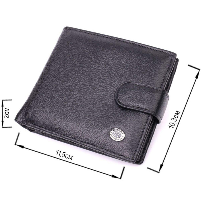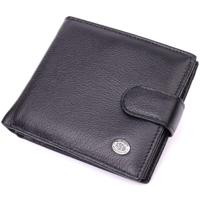 Чоловіче стильне портмоне, середнього розміру, що закривається хлястиком на кнопку. Модель пошита з якісної шкіри, яка чудово проявила себе у довгостроковій експлуатації. Аксесуар складається з двох відділень для купюр, двох прихованих кишень, одинадцяти осередків для пластикових карток, кишені під плівкою та монетниці. Модель упакована в коробочку, що дуже зручно, якщо виріб призначений для подарунка.
