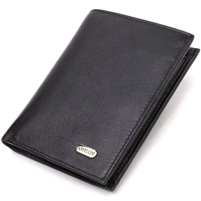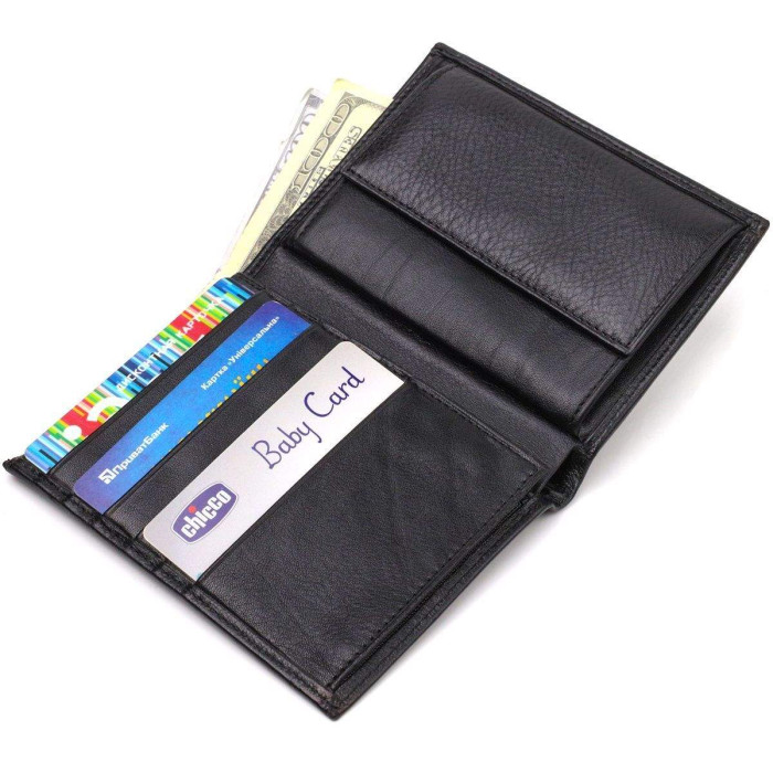 Універсальний чоловічий гаманець у класичному чорному кольорі з натуральної шкіри. Аксесуар має одне основне відділення з перегородкою, в яке поміщаються купюри всіх номіналів, шість кишень для карток, дві кишені під сіточкою для документів, монетницю та одну прилеглу кишеню. Закривається аксесуар навпіл без застібки. Запакований гаманець картонну коробку. Шкіряний гаманець є чудовим подарунком для рідних та близьких людей.