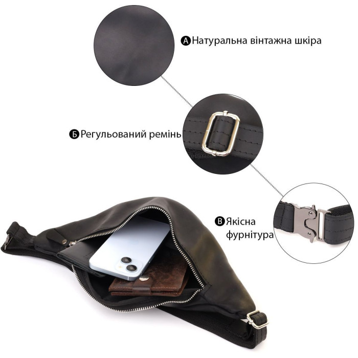 Чорний відтінок надає аксесуару строгий та елегантний вигляд, легко поєднується з будь-яким гардеробом та залишається актуальним незалежно від модних трендів. Вінтажна фактура шкіри надає сумці характеру і особливого шарму, виділяючи її серед звичайних моделей.