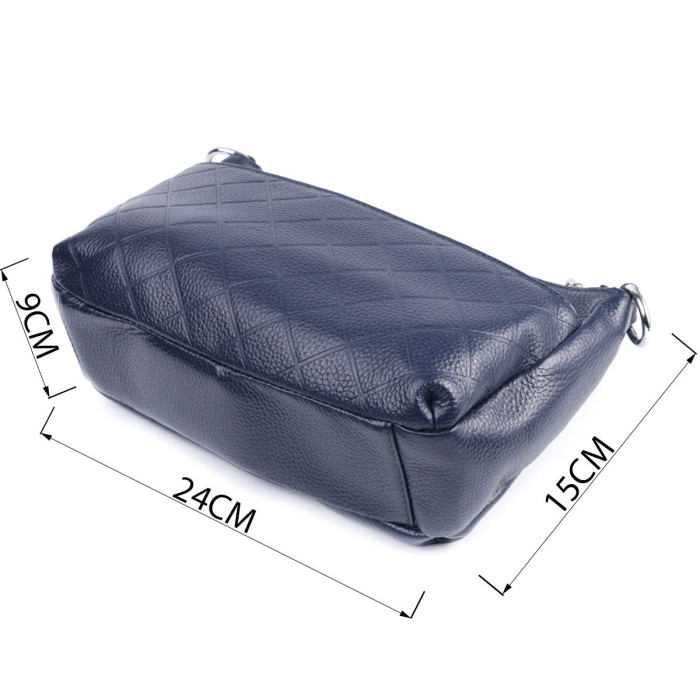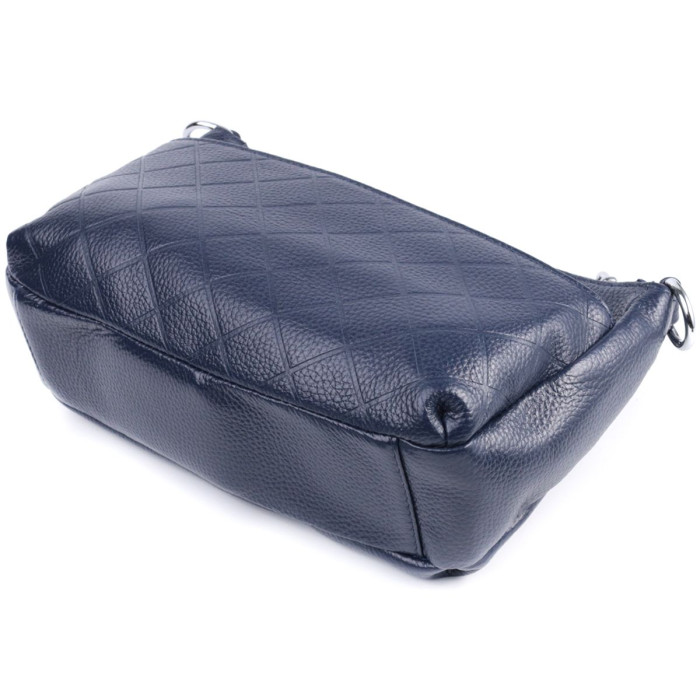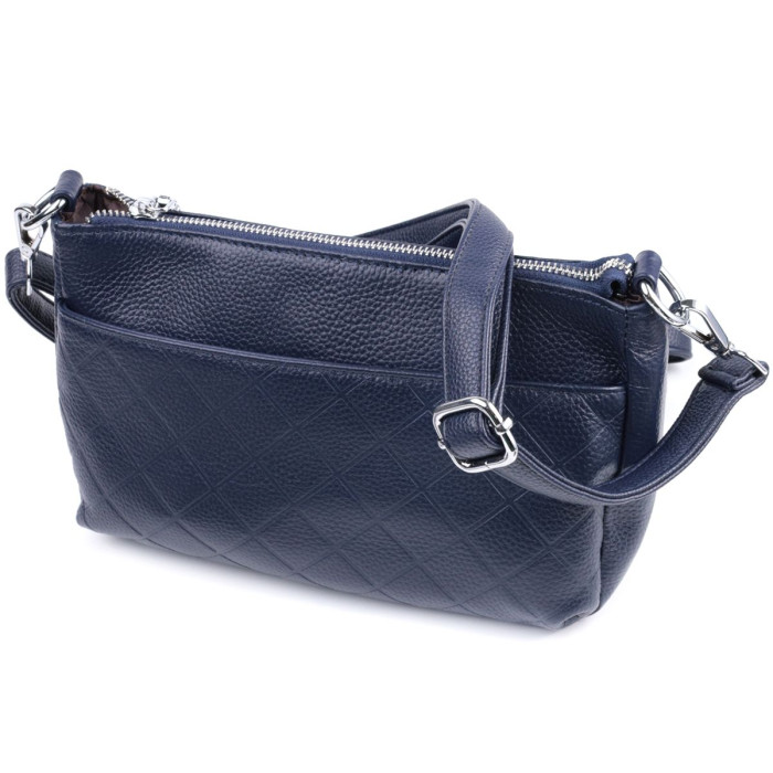 Стильна сумка для жінок у красивому синьому кольорі з натуральної шкіри високої якості. Виріб дуже зручний, можна носити на плечі та в руках. На лицьовій стороні сумка декорована ромбоподібним тисненням, що надає особливого шарму виробу. Модель доповнена фурнітурою кольору срібла. Аксесуар має три відділення, і дві кишеньки - одна на блискавці та одна відкритого типу, у відділенні, що посередині. Ідеальний варіант сумки на кожен день.