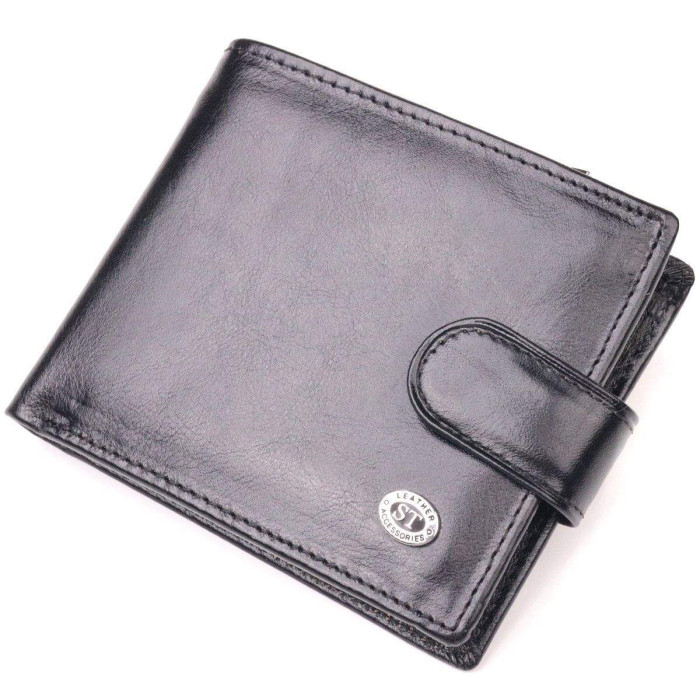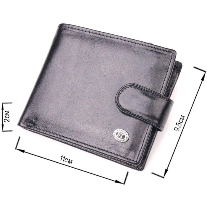 Стильний чоловічий гаманець у два складення з натуральної гладкої шкіри. Для перегородки між відділеннями використовується натуральна шкіра та міцний текстиль. Виріб складається з трьох великих відділень для купюр, двох прилеглих кишень, двох прозорих відділень, трьох осередків для карток та монетниці на кнопці. Продається гаманець у гарній коробці від виробника. Закривається гаманець хлястиком на кнопку.