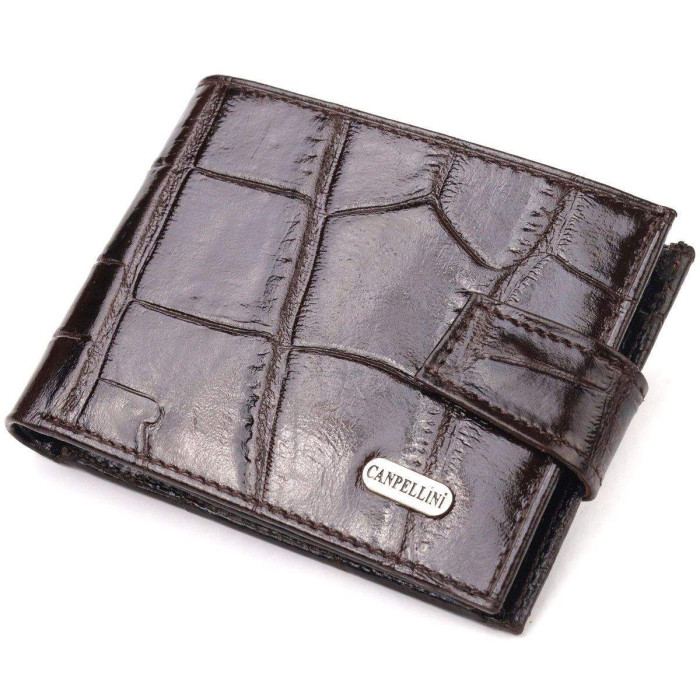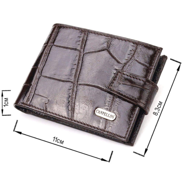 Цікавий чоловічий гаманець з натуральної фактурної шкіри з великим тисненням. Аксесуар має одне основне відділення з перегородкою, в яке поміщаються купюри всіх номіналів, дев'ять кишень для карток, дві з яких під сіточкою, монетниця та дві прилеглі кишені. Закривається аксесуар хлястиком на кнопку. Колір фурнітури – срібло. Ви легко зможете помістити його в кишеню штанів чи маленьку сумку. Запакований гаманець картонну коробку. Шкіряний гаманець є чудовим подарунком для рідних та близьких людей.