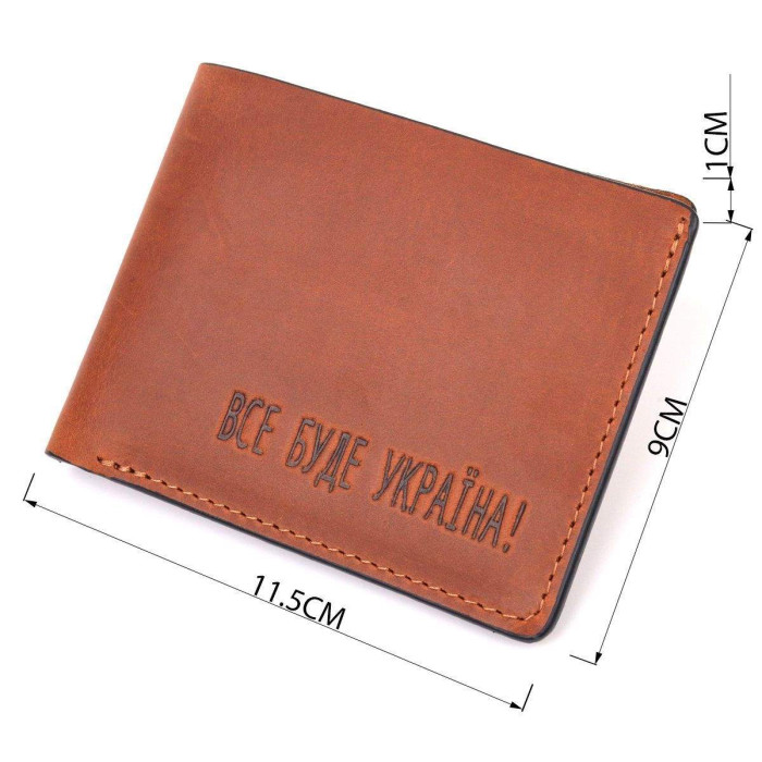 Функціональний шкіряний гаманець світло-коричневого кольору, з патріотичним написом "Все буде Україна". Виріб пошитий із якісної шкіри, з високими показниками зносостійкості. Портмоне має одне велике відділення для купюр усіх номіналів, а також достатню кількість відділень для карток, без застібки. Прекрасний подарунок на всі свята та знаменні дати.
