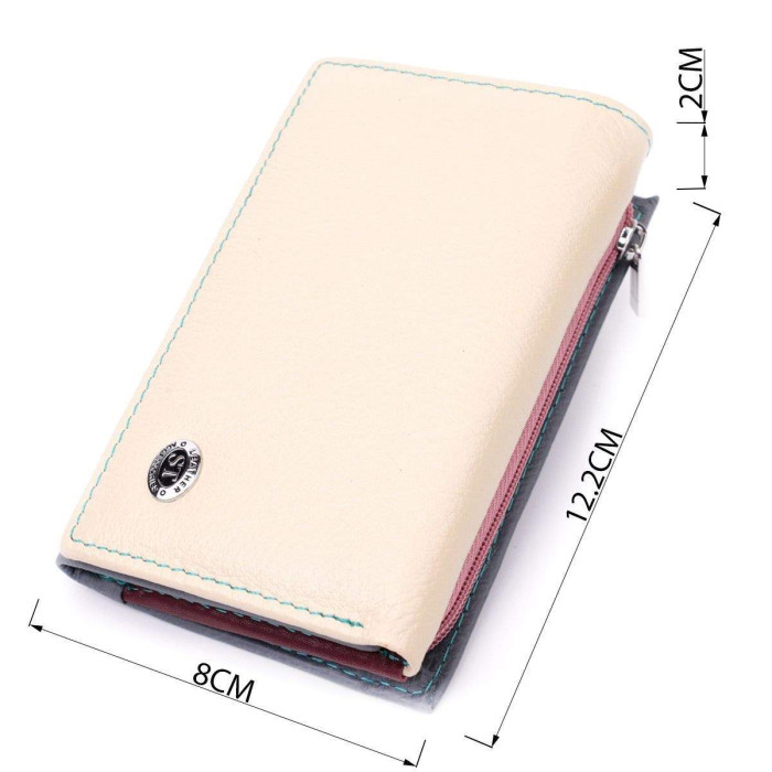 Стильне жіноче портмоне в три складання з натуральної шкіри найвищої якості. Перше, що впадає в око це колірне рішення, замість однотонного аксесуара ми маємо різнокольоровий, який містить два основні зовнішні кольори і кілька додаткових всередині. Шкіряне портмоне дуже практичне і служить досить довго. Аксесуар складається з двох містких кишень для купюр, кишені на блискавці через всю довжину, п'яти осередків для карт, прозорого віконця для пропуску та зовнішньої кишені на блискавці з перегородкою, що чудово прослужить для монет. Портмоне доповнено надійною фурнітурою. Укомплектований гаманець у фірмову картонну коробку білого кольору.