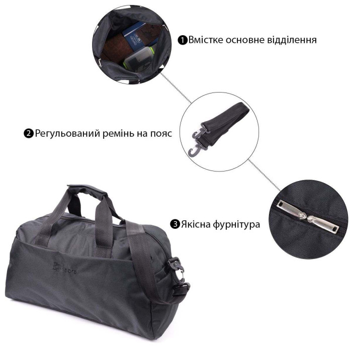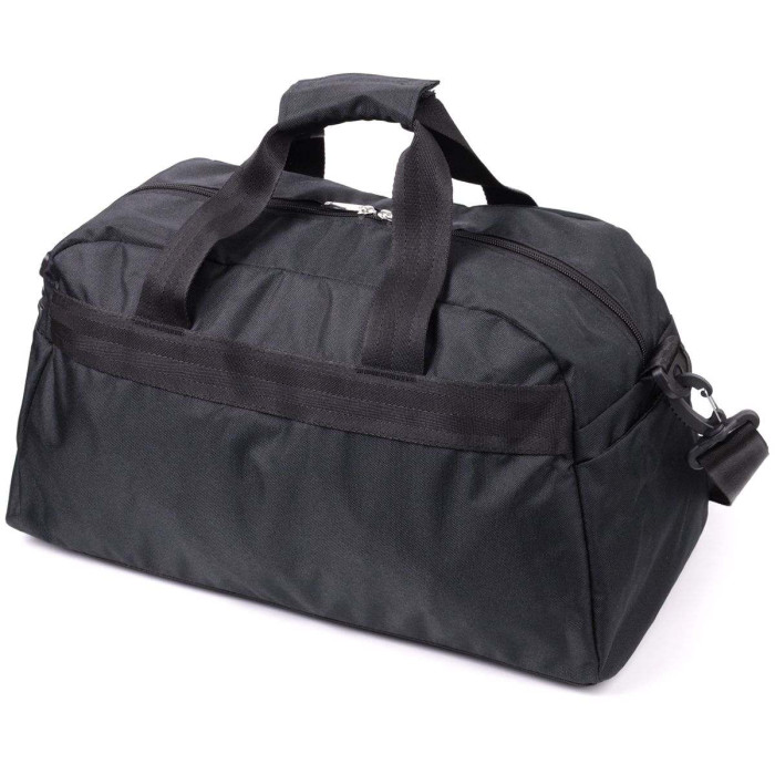 Дорожня сумка з якісного щільного матеріалу - поліестеру. На лицьовій стороні посередині розташований вишитий логотип бренду, що є запорукою якості. Виріб має невеликий розмір та практичний функціонал, все для Вашої зручності та практичного використання. Таку сумку зручно брати із собою у невеликі подорожі, на тренування, а також у невеликі вилазки за місто. Аксесуар складається з одного просторого відділення та трьох кишень різних розмірів зовні, що дуже зручно. Носити аксесуар можна в руках, за допомогою текстильних ручок із з'єднувачем на липучці для більшої зручності, а також на плечі, для цього передбачений ремінь, що знімається. Пошита сумка акуратно, всі рядки рівні, міцна підкладка - чорного кольору, фурнітура надійна і якісна. Стильна сумка стане бажаним подарунком для ваших рідних і близьких і найголовніше дуже корисним і необхідним.