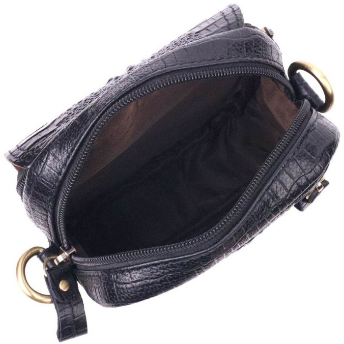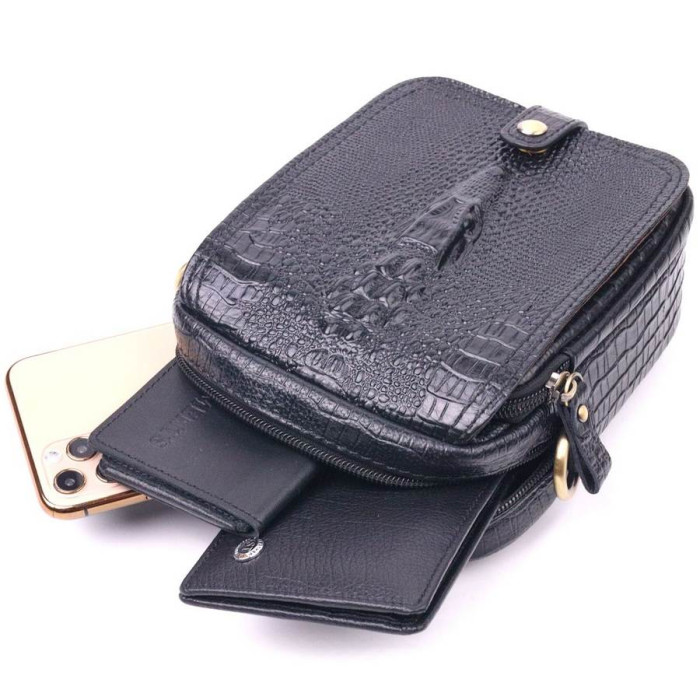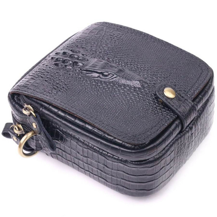 Сучасна чоловіча сумка невеликого розміру із натуральної фактурної шкіри з тисненням під крокодила. Модель, яка ідеально підійде на кожен день. В аксесуарі одне основне відділення та дві кишені різних розмірів, сумку можна носити на плечі. Основним акцентом у цій сумці є декор у вигляді голови крокодила, зовні. Доповнено виріб якісною фурнітурою жовтого кольору. Сумка стане чудовим подарунком для близької людини.