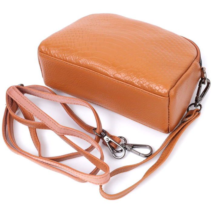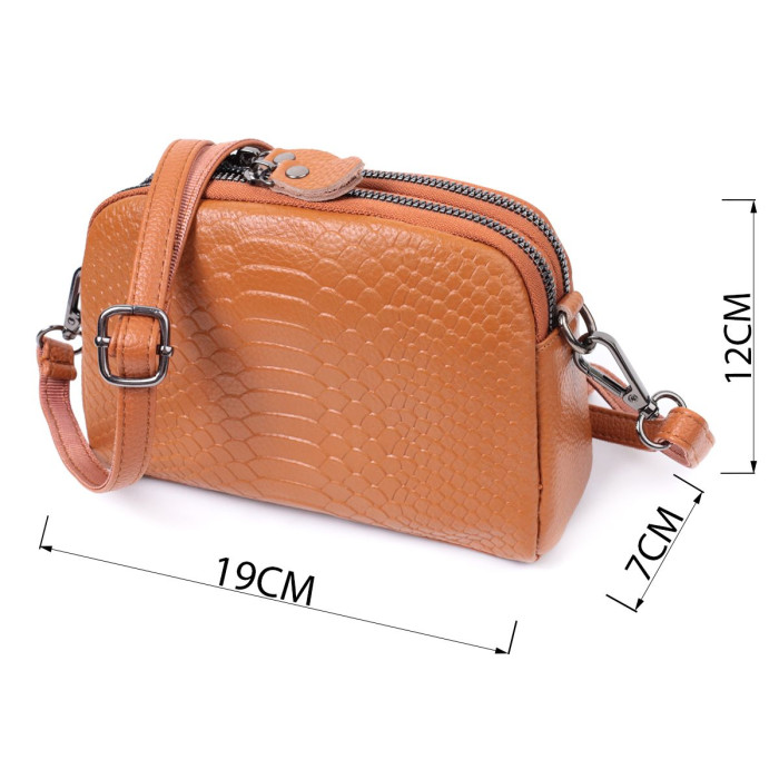 Стильна жіноча сумка з натуральної шкіри високої якості з тисненням під змію. Виріб дуже зручний, можна носити на плечі та через плече, на кисті та просто під рукою як клатч. Модель доповнена фурнітурою кольору темного срібла. Аксесуар має два основні відділення у яких дві кишеньки - одна на блискавці та одна відкритого типу, а також кишеня на блискавці зовні, на тильній стороні. Ідеальний варіант для будь-якої дівчини, яка цінує якість і має чудовий смак.
