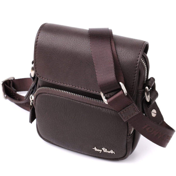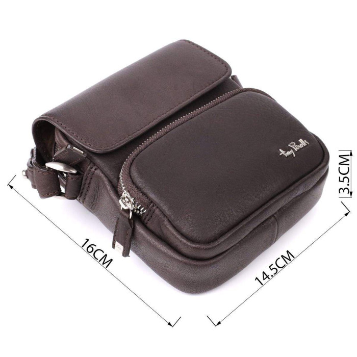Коричнева шкіряна сумка Tony Perotti - це поєднання функціональності, елегантного дизайну та преміальної якості. Аксесуар виконаний з натуральної телячої шкіри, приємної на дотик та стійкої до зносу. Продумана внутрішня організація дозволяє зручно розмістити документи, телефон, карти, ручки та дрібні особисті речі. Класичний дизайн, фірмовий логотип та надійна фурнітура роблять сумку універсальним вибором для сучасного чоловіка та чудовою ідеєю для подарунка.