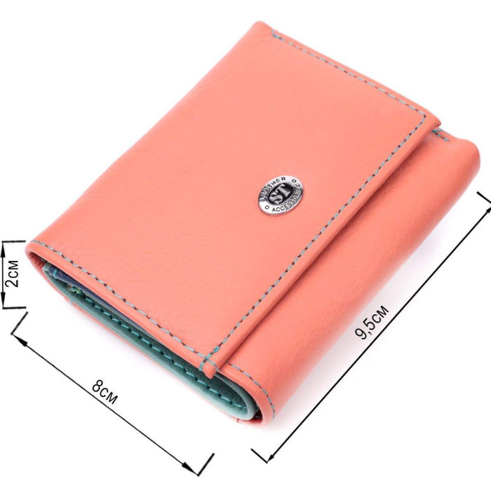 Барвисте жіноче портмоне в три складання з натуральної шкіри найвищої якості. Акцентом цього гаманця є колір, точніше кілька кольорів – він помаранчевого кольору зовні та багатобарвний усередині. Аксесуар складається з двох містких відділень для купюр, двох осередків для карток та кишені для монет. Зовні виріб прошитий рівним рядком бірюзового кольору по краю і прикрашений металевим логотипом компанії виробника. Портмоне доповнено надійною фурнітурою та міцною підкладкою. Укомплектований гаманець у фірмову картонну коробку білого кольору.