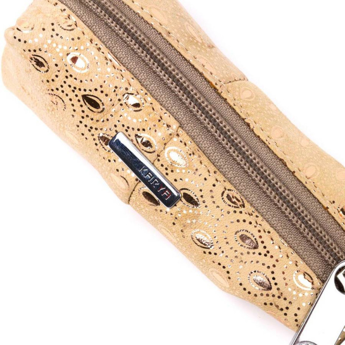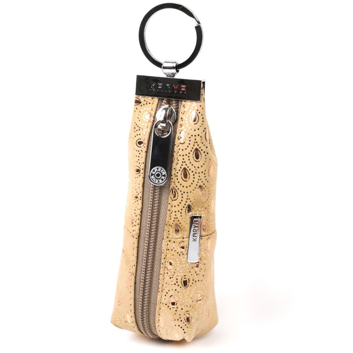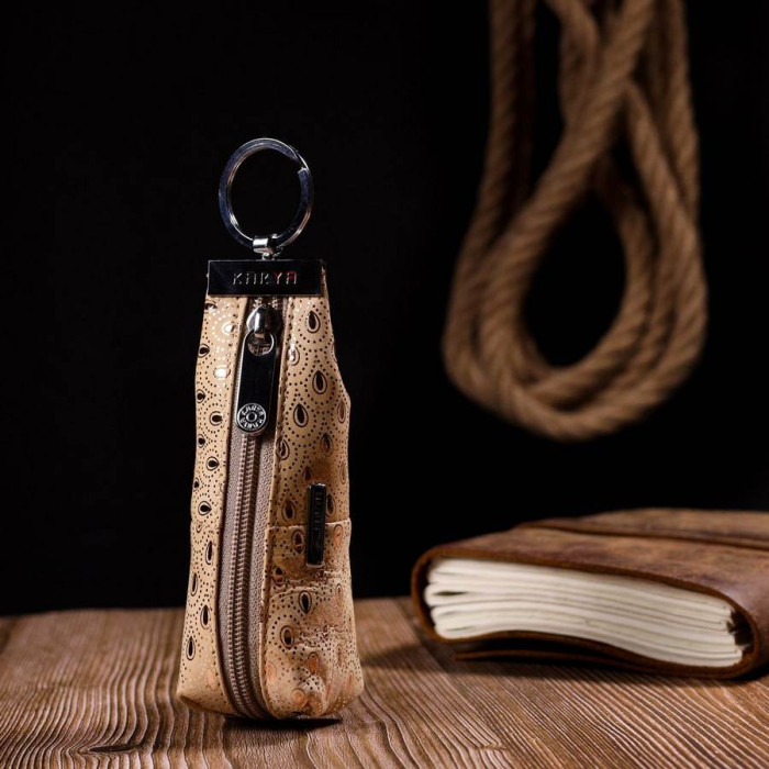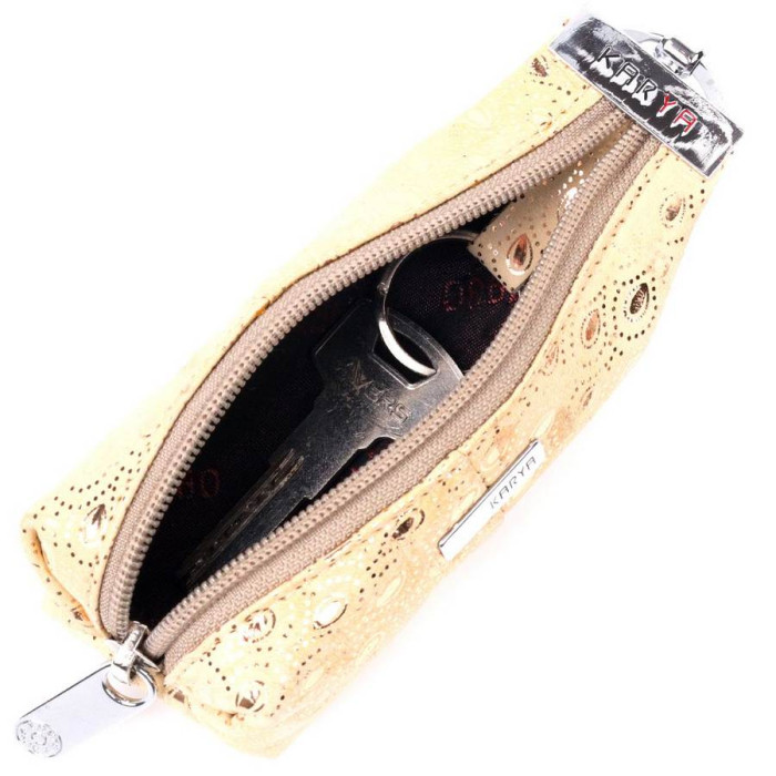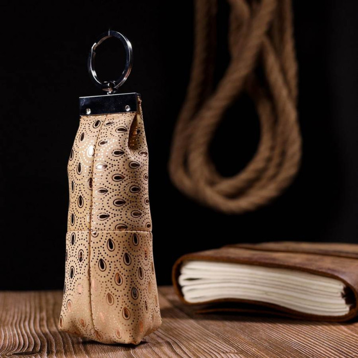 Красива ключниця золотистого кольору з натуральної шкіри. Всі матеріали з яких виконано виріб, шкіра, фурнітура, підкладка - високої якості з підвищеними показниками стійкості до різного зносу. Аксесуар упакований у фірмову коробку, буде чудовим подарунком для будь-якої жінки.