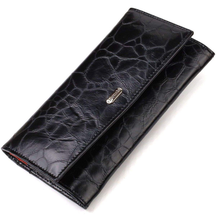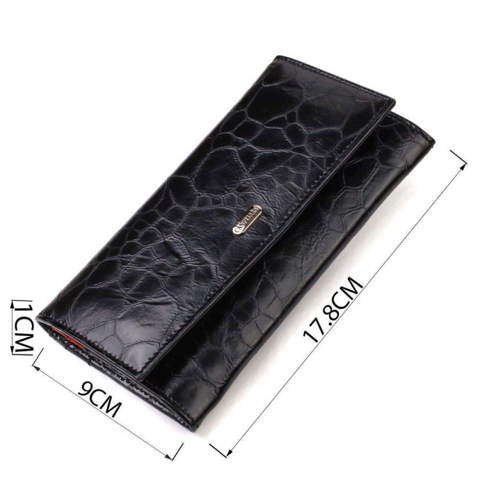 Фактурний жіночий гаманець горизонтального типу із натуральної шкіри. Аксесуар має одне основне відділення, шість кишень для карток (одна під сіточкою), одна прихована кишеня, три прилеглі кишені та монетниця. Закривається аксесуар клапаном на кнопку. Купуючи шкіряний аксесуар цієї фірми, собі чи на подарунок, будьте певні, що він прослужить Вам не один рік.