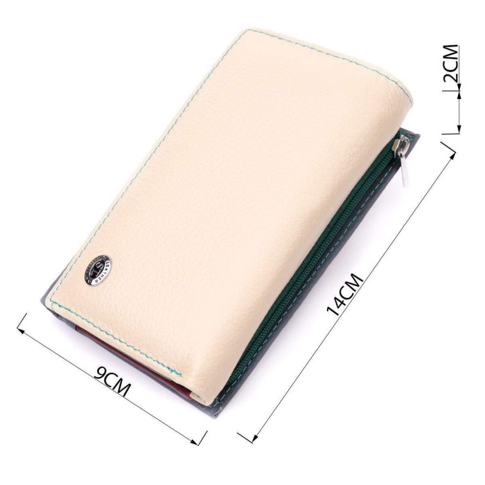 Оригінальне жіноче портмоне в три складання зручного середнього розміру з натуральної шкіри найвищої якості. Перше, що впадає в око це колірне рішення, замість однотонного аксесуара ми маємо різнокольоровий, який містить два основні зовнішні кольори і кілька додаткових усередині. Шкіряне портмоне дуже практичне і служить досить довго. Аксесуар складається з двох містких кишень для купюр, кишені на блискавці через всю довжину, п'яти осередків для карт, прозорого віконця для пропуску та зовнішньої кишені на блискавці з перегородкою, що чудово прослужить для монет. Портмоне доповнено надійною фурнітурою. Укомплектований гаманець у фірмову картонну коробку білого кольору. Виріб стане ідеальним подарунком для дівчини будь-якого віку