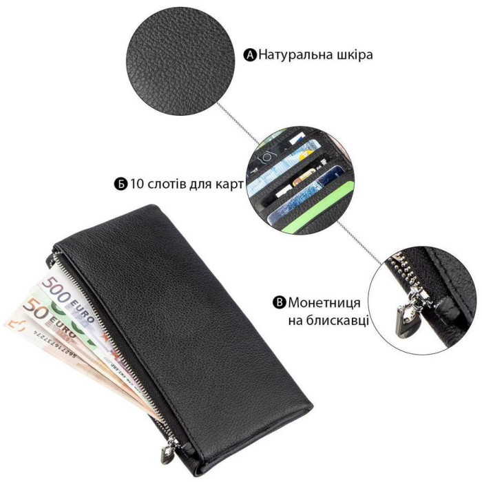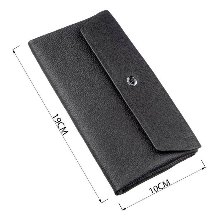 Неабиякий жіночий клатч на всі випадки життя з натуральної шкіри. Виконано в чорному кольорі, завдяки чому, підійде під будь-який гардероб своєї господині. Вас обов'язково здивує висока якість даного аксесуара, а значить, він прослужить Вам дуже довго. В даний гаманець-клатч поміститься все необхідне, від грошових купюр до кредитних карток. На тильній стороні розташована кишеня на блискавці для монет або інших цінних дрібниць, що дуже зручно і практично. Ви можете придбати виріб, як для себе улюбленої, так і на подарунок близькій людині. У будь-якому випадку власниця гаманця залишиться задоволеною. Упакований клатч в фірмову коробку білого кольору з картону.