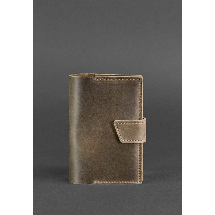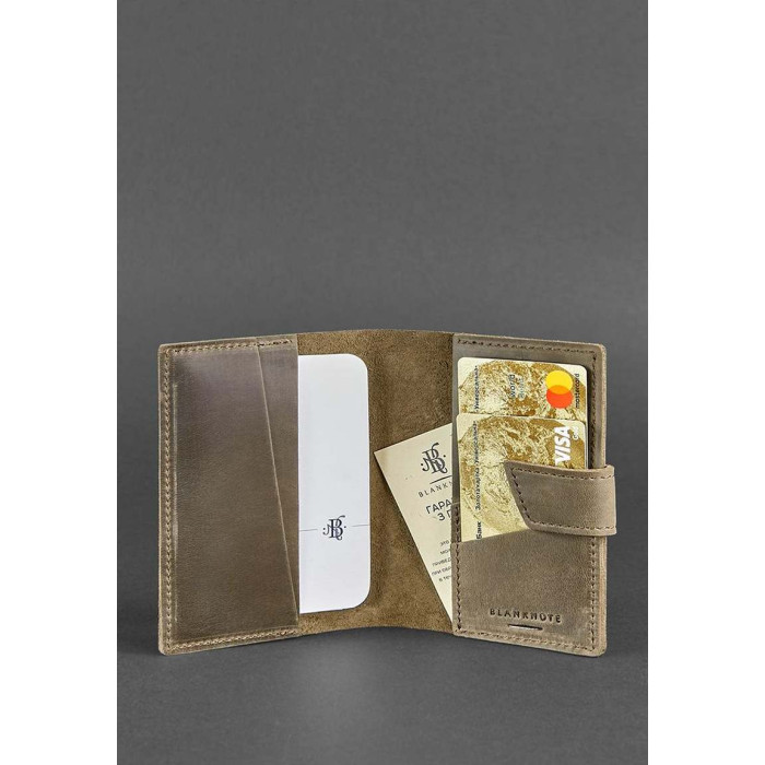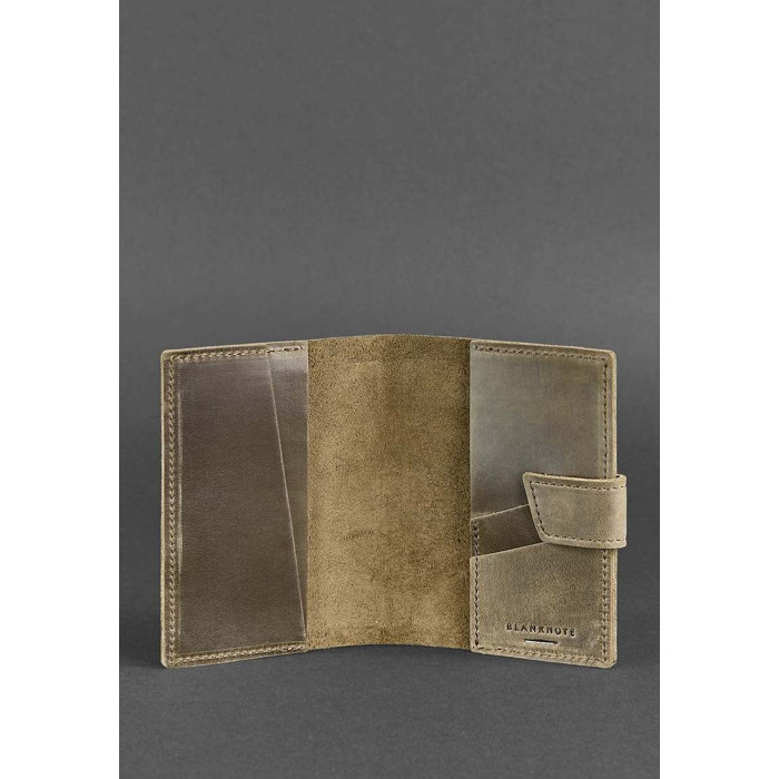 Всередині є 2 відділення для паспортів і 2 кишені для карток і візиток. Закривається обкладинка на металеву кнопку.