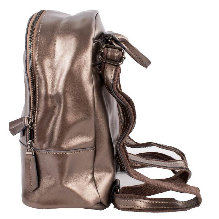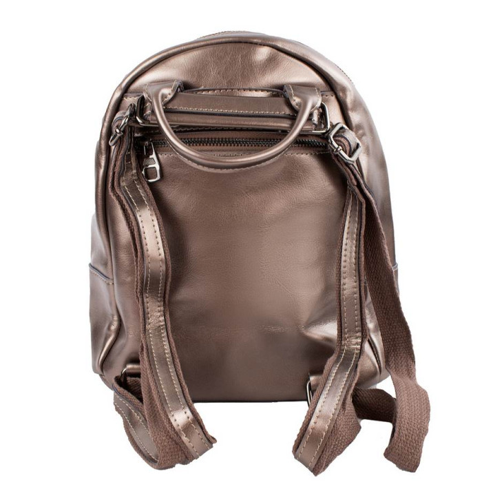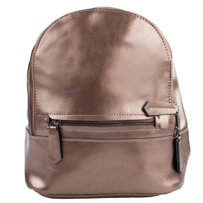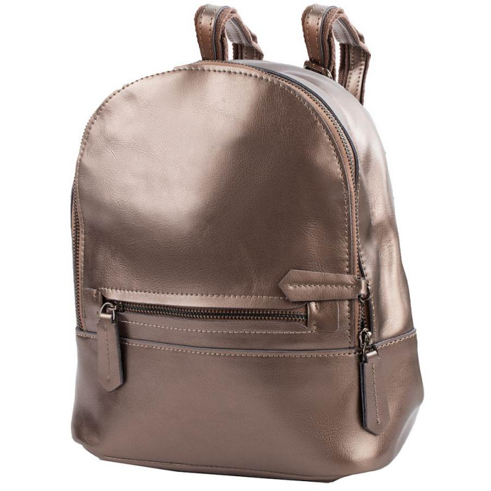 Зовнішні розміри рюкзака: 23 (замір по дну, вгорі звужується рюкзак) х 26 х 12. Кількість основних відділень: 1. Усередині є 1 кишеня на блискавці та 2 накладні. Матеріал: шкіра. Матеріал підкладки: тканина. Колір: бронзовий. Колір фурнітури: чорне срібло. На тильній стороні розташована 1 кишеня на блискавці. На лицьовому боці прорізна кишеня на блискавці. Рюкзак має щільну ручку, щоб переносити виріб у руці або повісити на гачок. Дно виробу ущільнене. Рюкзак закривається за допомогою блискавки. Виріб упакований у поліетиленовий пакет. Документи формату А4 не поміщаються у рюкзак. Країна походження торгової марки VALIRIA FASHION та країна-виробник - Китай. Гарантія: 3 місяці.