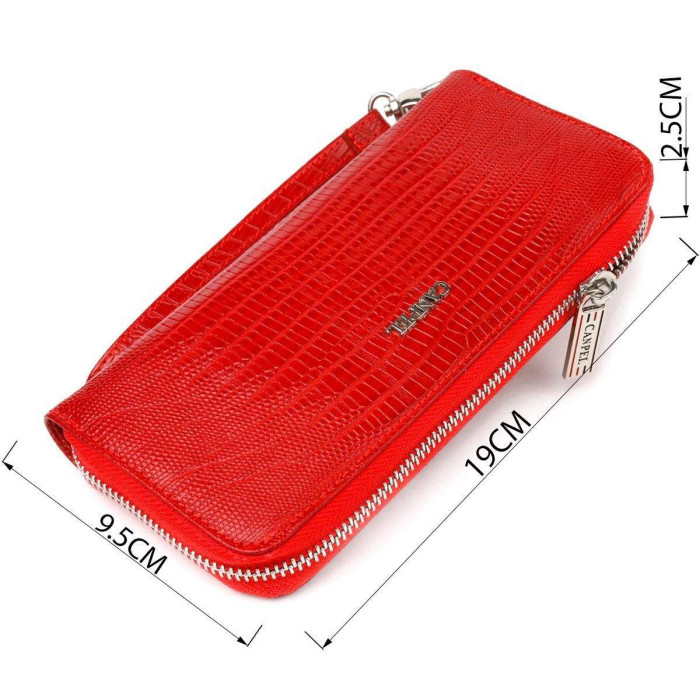 Яскравий жіночий гаманець із натуральної фактурної шкіри. Аксесуар має три основні відділення, в які поміщаються купюри всіх номіналів, дві перегородки, одна з них на блискавці, вісім кишень для карток, дві прилеглі кишені та знімний кистьовий ремінь. Закривається аксесуар на блискавку. Відмінний аксесуар, надійний виробник, який прослужить дуже довго.