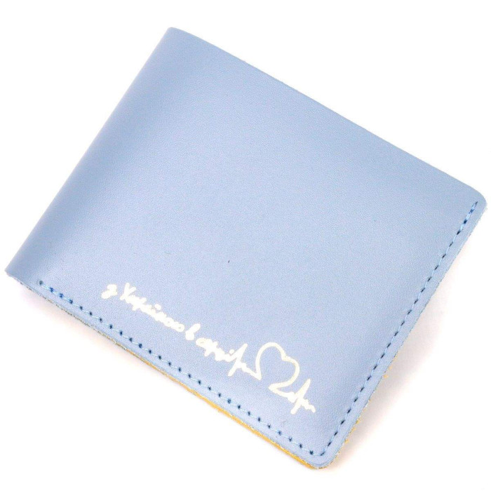Стильний шкіряний гаманець, у комбінації двох кольорів блакитного зовні та жовтого всередині з патріотичним написом “З Україною в серці”. Виріб пошитий із якісної шкіри, з високими показниками зносостійкості. Портмоне має одне велике відділення для купюр усіх номіналів, а також достатню кількість відділень для карток, без застібки. Шкіряний гаманець стане чудовим подарунком на всі випадки життя.