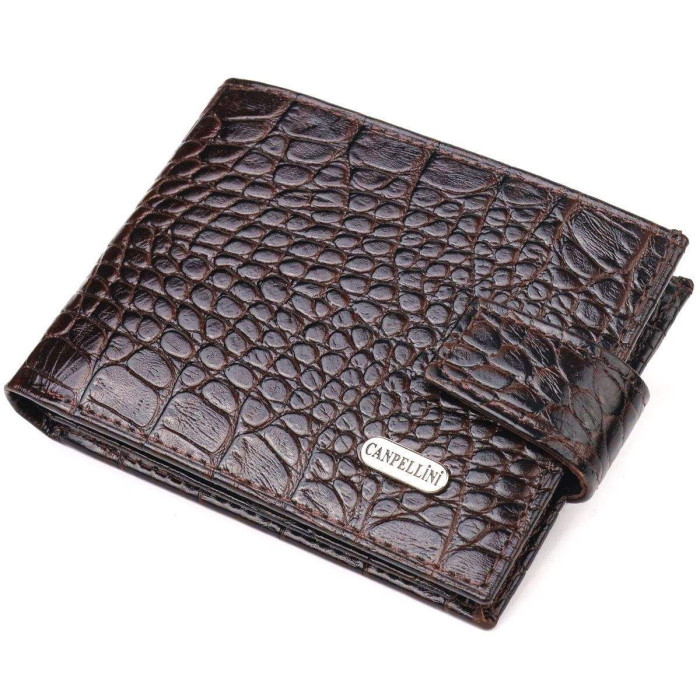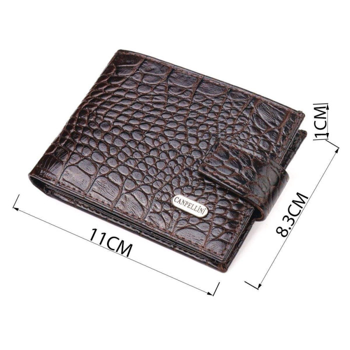 Оригінальний чоловічий гаманець з натуральної фактурної шкіри з тисненням під крокодила. Аксесуар має одне основне відділення з перегородкою, в яке поміщаються купюри всіх номіналів, дев'ять кишень для карток, дві з яких під сіточкою, монетниця та дві прилеглі кишені. Закривається аксесуар хлястиком на кнопку. Колір фурнітури – срібло. Ви легко зможете помістити його в кишеню штанів чи маленьку сумку. Запакований гаманець картонну коробку. Шкіряний гаманець є чудовим подарунком для рідних та близьких людей.