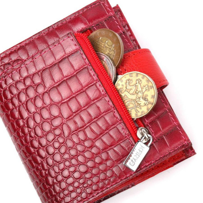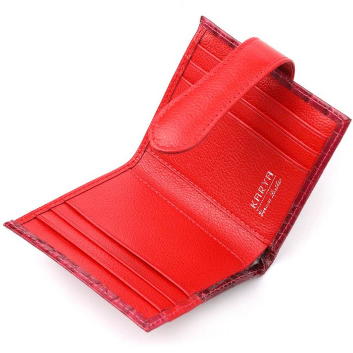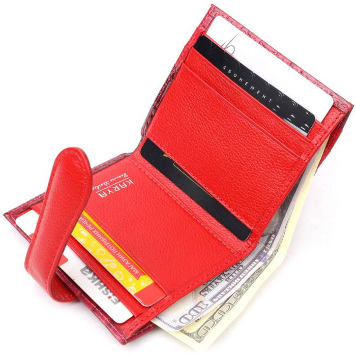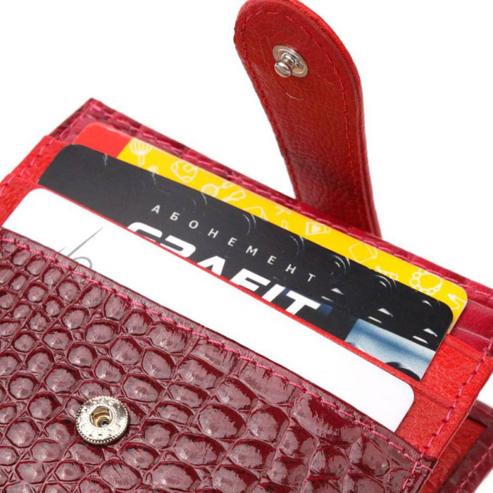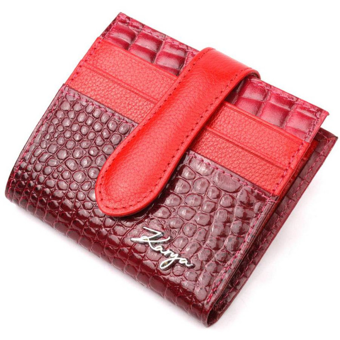 Яскравий невеликий жіночий гаманець із натуральної комбінованої шкіри - класичної зернистої червоного кольору та лакованої рожевої з тисненням під рептилію. Усередині є відділення для купюр та осередки для кредитних карток. У виробі використано якісну фурнітуру, а також міцну фірмову підкладку. Невеликий шкіряний гаманець поміститься навіть у найменшу сумочку. Модель закривається на шкіряний хлястик з кнопкою. Такий гаманець однозначно порадує будь-яку жінку.