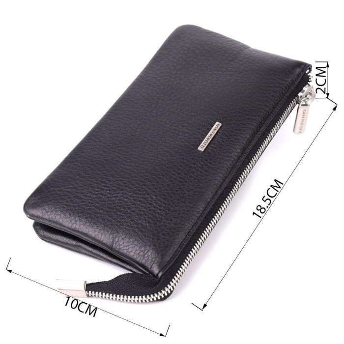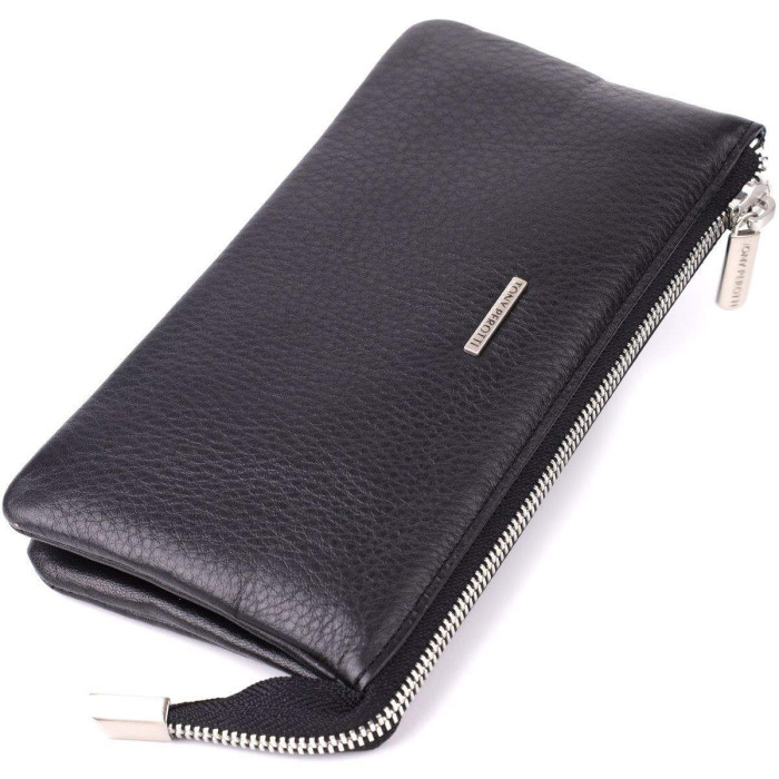 Чорне шкіряне портмоне-клатч Tony Perotti поєднує елегантний дизайн та продуману організацію внутрішнього простору. Містке основне відділення та додаткові кишені забезпечують зручне зберігання купюр, монет, карт та телефону. Натуральна шкіра підкреслює преміальний характер виробу, роблячи його довговічним та стильним аксесуаром.
