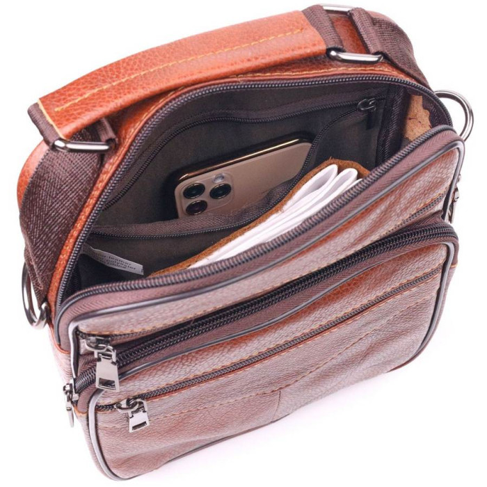 Зручна чоловіча сумка середнього розміру із натуральної шкіри. Модель, яка ідеально підійде на кожен день. В аксесуарі одне основне відділення та шість кишень різних розмірів, сумку можна носити як у руці, так і на плечі. У сумку з легкістю помістяться всі необхідні речі. З таким аксесуаром усі Ваші речі будуть у порядку, з ним також буде зручно ходити на роботу чи зустрічі. Доповнено виріб якісною фурнітурою, темно-срібло кольору. Сумка стане чудовим подарунком для близької людини.