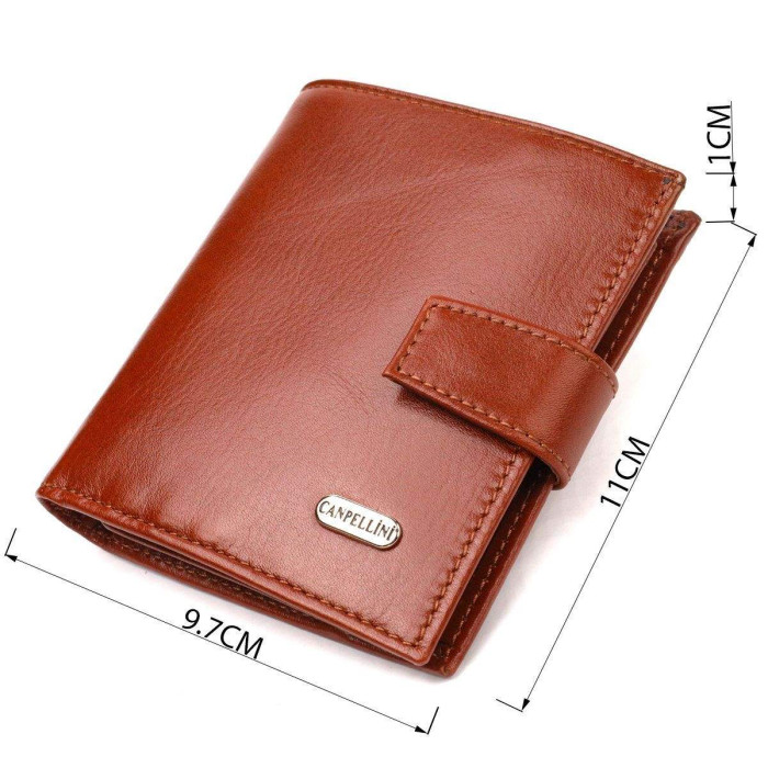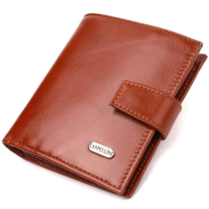 Цікавий компактний чоловічий гаманець із натуральної гладкої шкіри. Аксесуар має основне відділення з перегородкою, п'ять відсіків для карток, дві прилеглі кишені, прозору кишеню для документів та монетницю. Закривається аксесуар хлястиком на кнопку. Відмінний аксесуар від надійного виробника, що прослужить дуже довго.