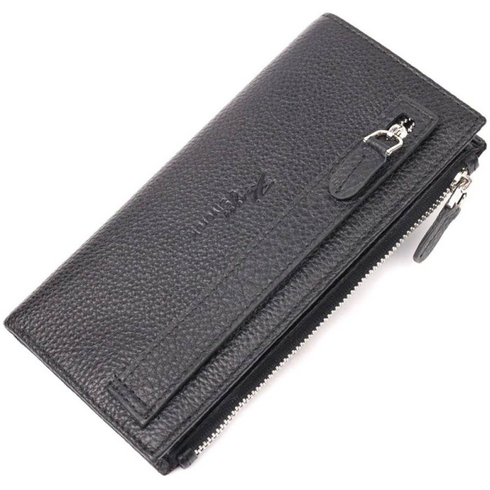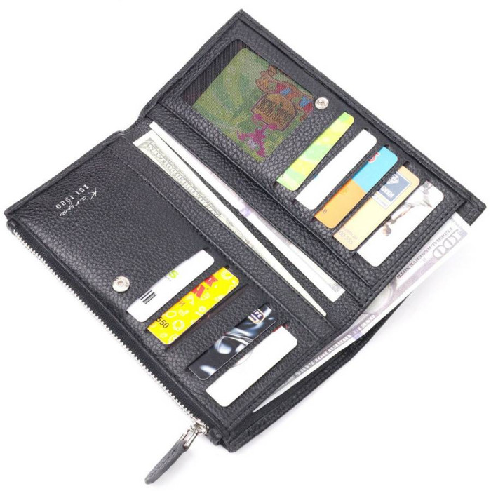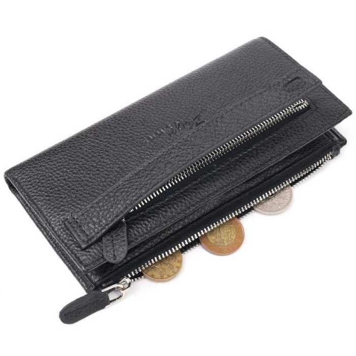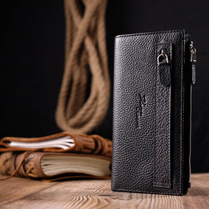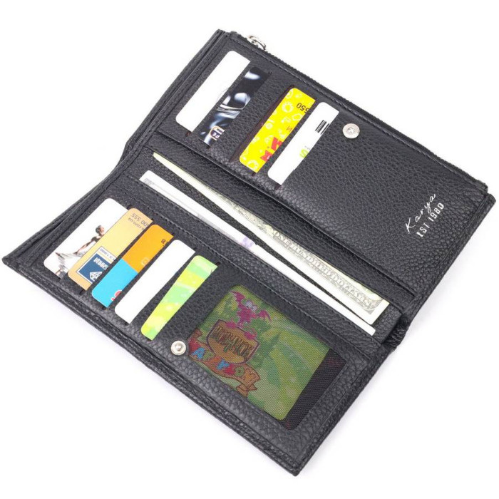Многофункциональный кошелек из натуральной кожи в классическом черном цвете. Складывается аксессуар пополам, закрывается на кнопку. Качественная фурнитура дополняет и украшает изделие. Такой кошелек из натуральной кожи - это идеальный вариант на каждый день для тех, кто ценит качество, удобство и комфорт, а также будет отлично дополнять Ваш повседневный образ. Упакован аксессуар в фирменную коробку и пакет бренда. Изделия из натуральной кожи всегда будут отличным подарком для близкого человека.