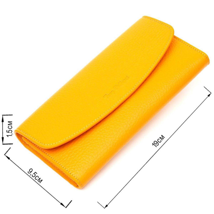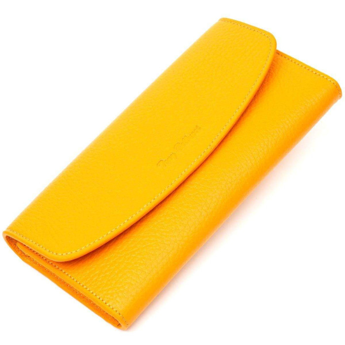 Модний жіночий гаманець із натуральної шкіри флотар, для якої характерна міцність, зносостійкість та зерниста фактура. Аксесуар складається з одного широкого відділення для купюр, дванадцяти осередків для пластикових карток, однієї прилеглої кишені та монетниці на блискавці. У виробі використано якісну фурнітуру золотистого кольору. Закривається гаманець клапаном на кнопку. Купуючи цей шкіряний гаманець, Ви не тільки набуваєте стильної речі, але й отримуєте якісний аксесуар, який прослужить не один рік.