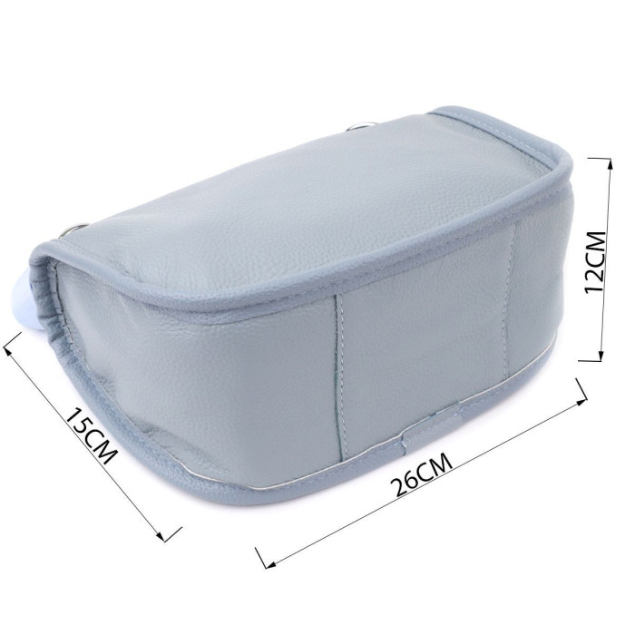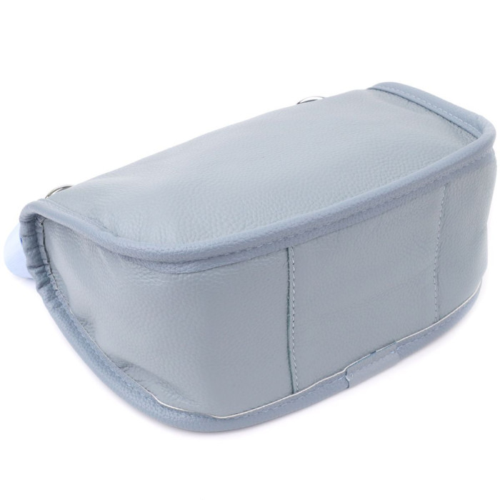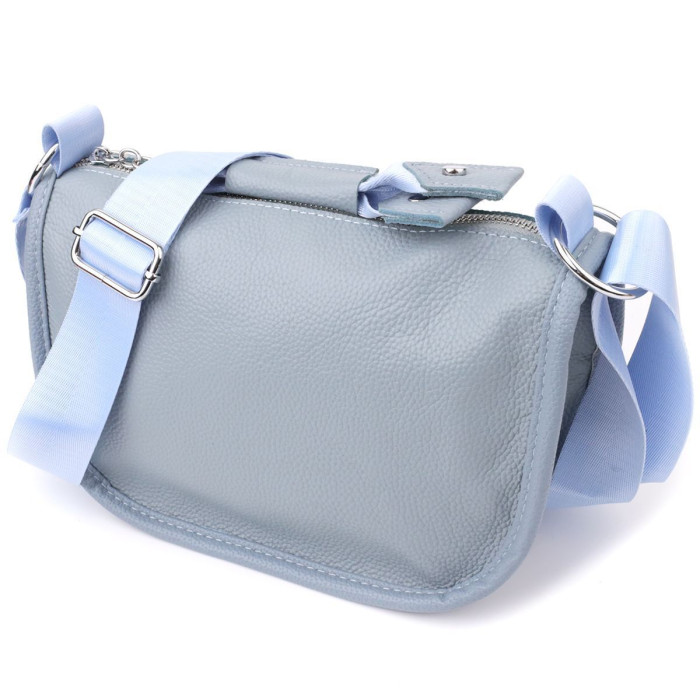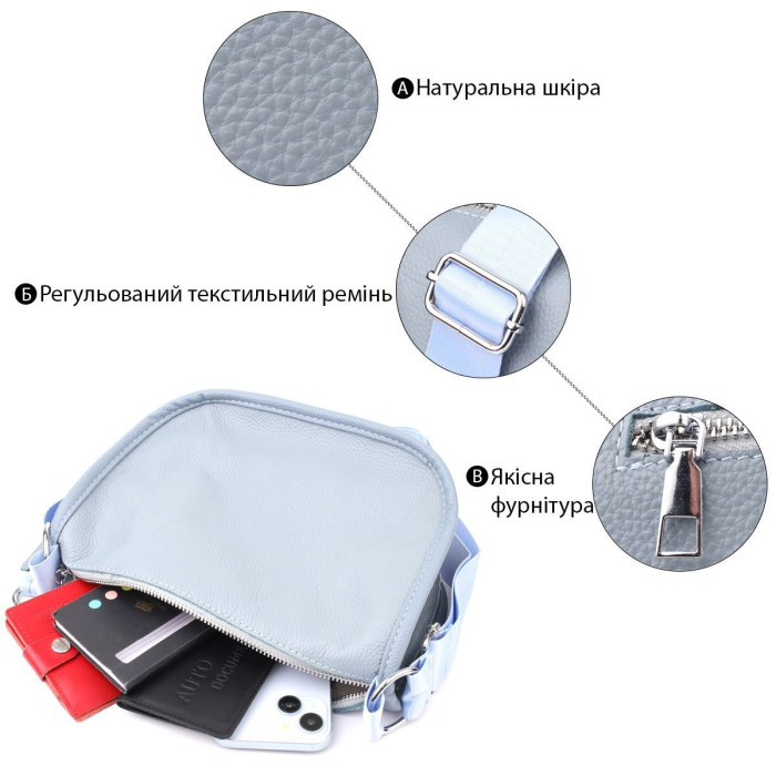 Жіноча шкіряна сумка у сіро-блакитному кольорі виконана з якісної зернистої шкіри та має напівкруглу акуратну форму, що підкреслює сучасний та елегантний стиль. Особливий акцент моделі - декоративний бігунок у вигляді стильного брелка, який додає індивідуальності та вишуканості. Сумка закривається на блискавку, всередині розташоване основне відділення із двома кишенями на блискавці та двома відкритими кишенями для дрібниць, на тильній стороні є зовнішня кишеня на блискавці. Незнімний текстильний ремінь забезпечує комфортне носіння, а фурнітура під срібло гармонійно відтіняє холодний сіро-блакитний тон шкіри. Ця сумка стане універсальним аксесуаром для повсякденного використання та особливих випадків, поєднуючи практичність та стиль.