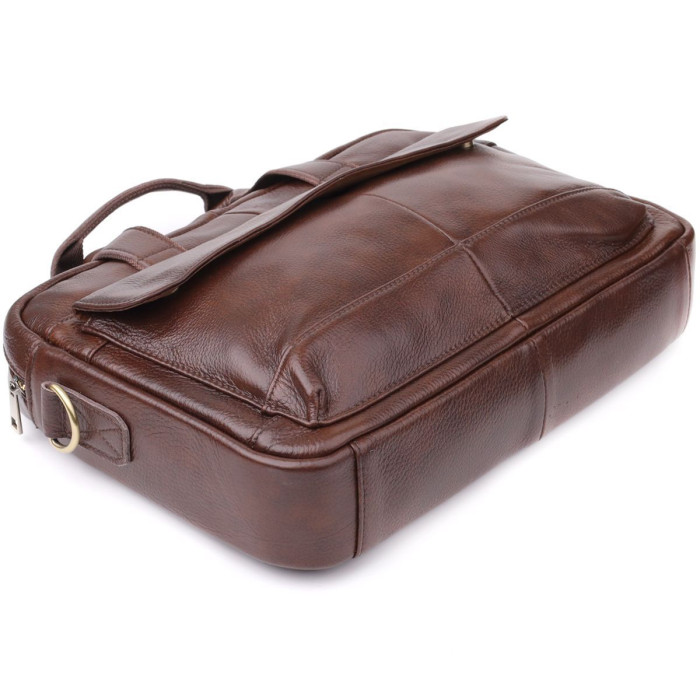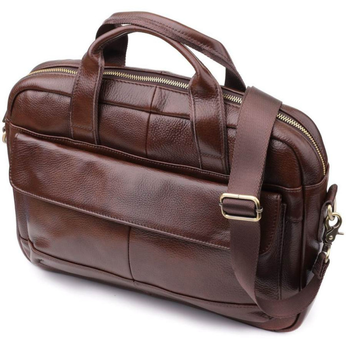 Фурнітура у кольорі "під латунь" підкреслює благородний характер виробу та гармонійно поєднується з тоном шкіри. Для перенесення передбачені дві міцні шкіряні ручки, а також знімний регульований текстильний ремінець, який дозволяє носити портфель на плечі або через плече.