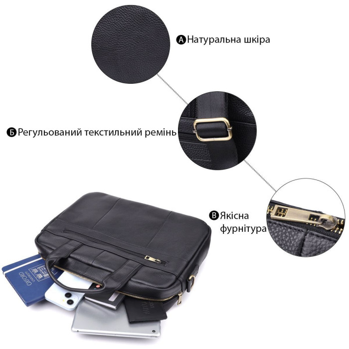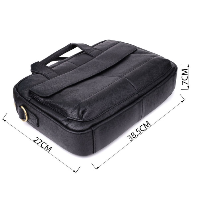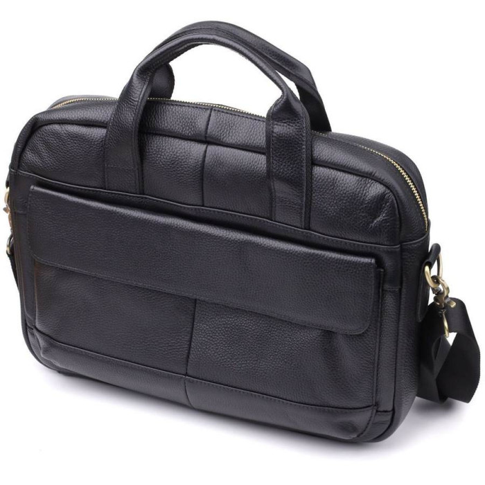 Фурнітура у відтінку "під латунь" надає моделі благородного акценту і підкреслює діловий характер. Для перенесення передбачені дві міцні шкіряні ручки, а також знімний регульований текстильний ремінець, який можна носити на плечі або через плече.