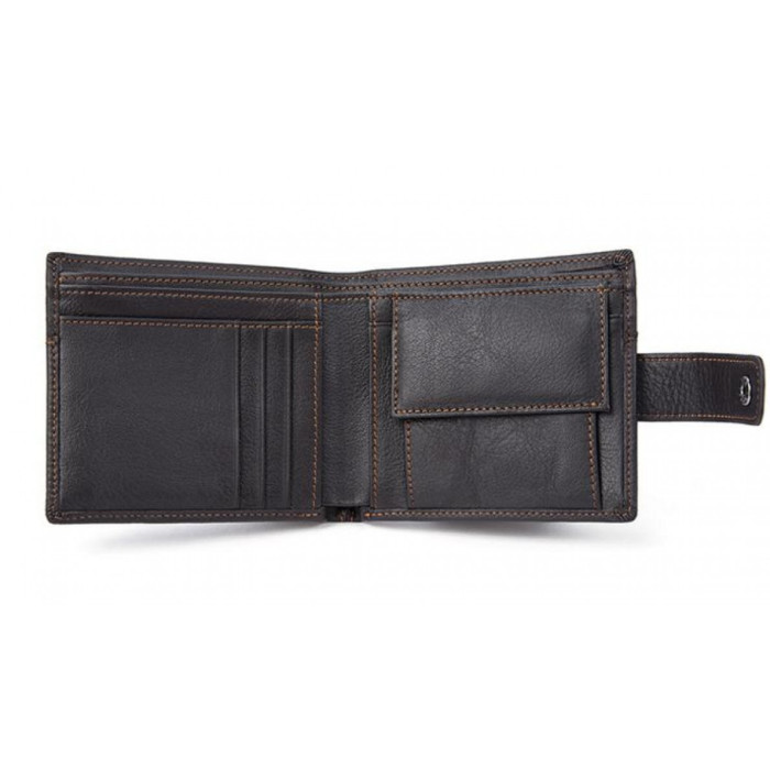 Сучасне цікаве чоловіче портмоне від бренду Bexhill зроблене з натуральної шкіри чорного кольору. Особливістю даної моделі є скошена відкрита кишеня з лицьового боку виробу, де знаходиться шкіряний вкладиш - прозора кишеня для фото, прав. Всередині є основні відділення для купюр і кишеня на кнопці для монет. Також в портмоне є безліч слотів для банківських карт.
