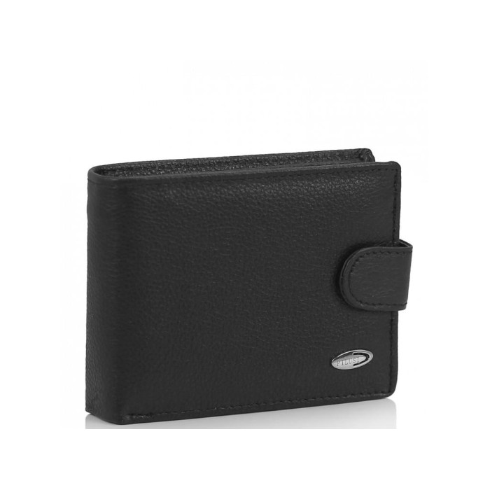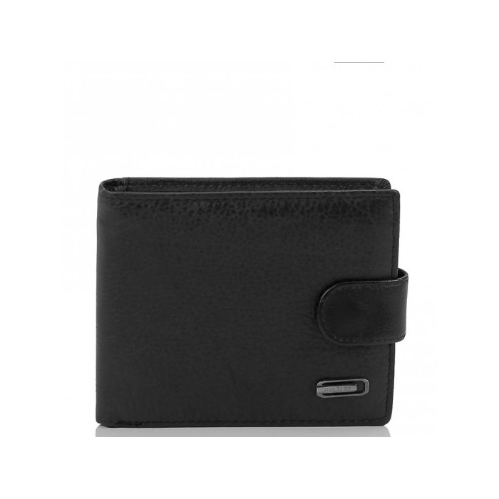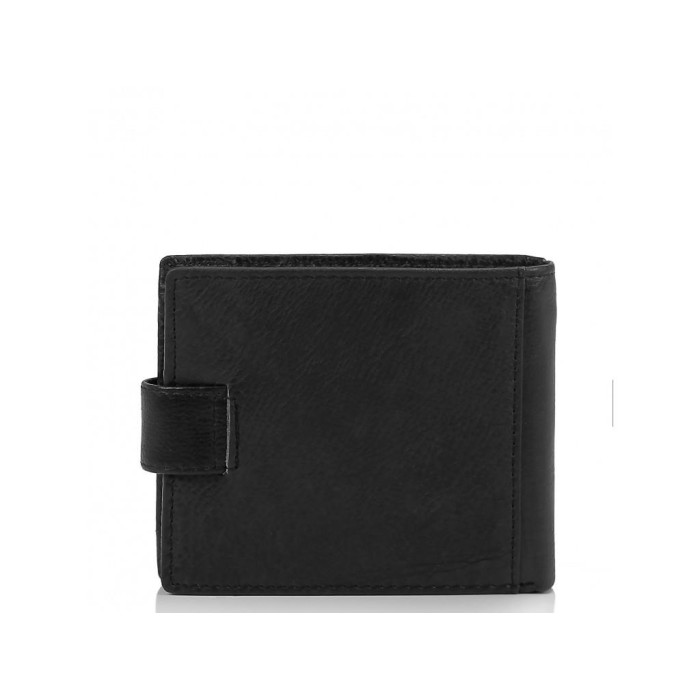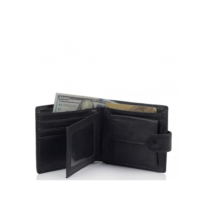 Чорний шкіряний гаманець чоловічий. Закривається на хлястик на кнопці. Гаманець складається з двох основних секцій для купюр, одного відділення на блискавці, має сім слотів для карт, три прозорих віконця для фото або прав, а також кишеню для монет на кнопці.