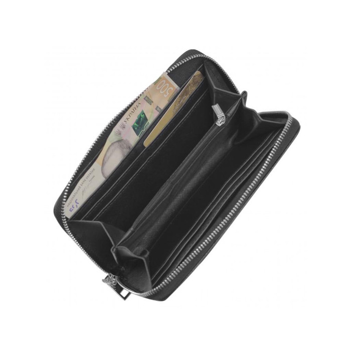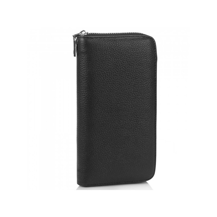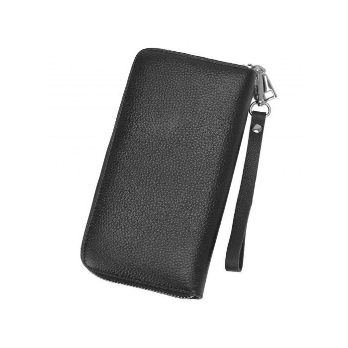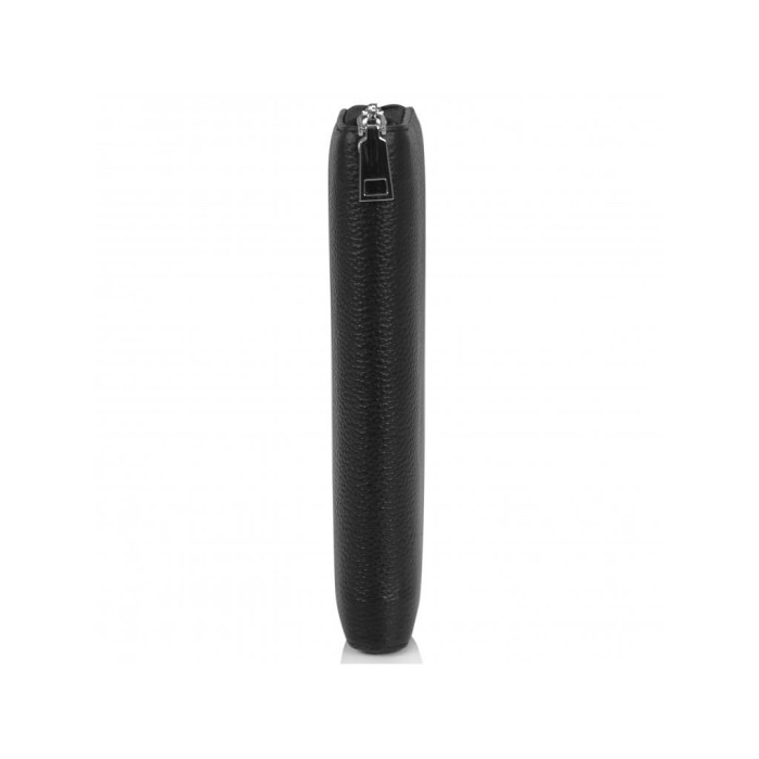Чоловіче портмоне чорного кольору на одне відділення. Є ремінець для носіння портмоне на зап'ясті. Всередині основний відділ розділений кишенею-перегородкою на блискавці, з боків є слоти для карт, а також слоти відкритого типу для купюр або інших дрібниць.
