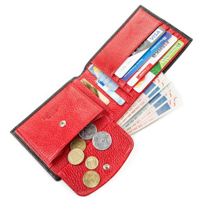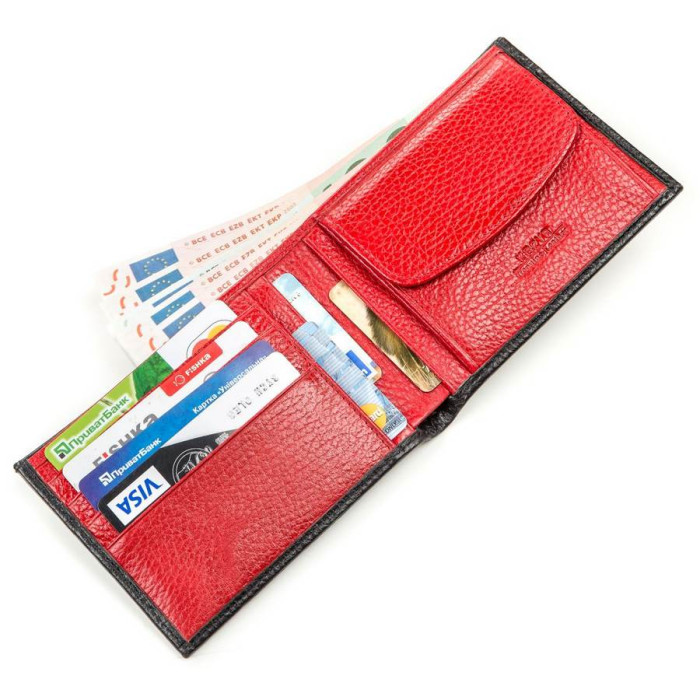 - гаманець упакований у фірмову коробочку. містке чоловіче портмоне, з натуральної фактурної шкіри, більше відомої як "флотар". Дуже красивий і стильний аксесуар, який складається з поєднання двох кольорів шкіри: чорної зовні і червоної всередині.