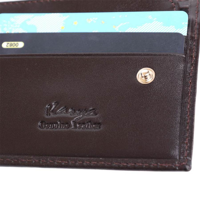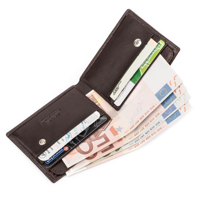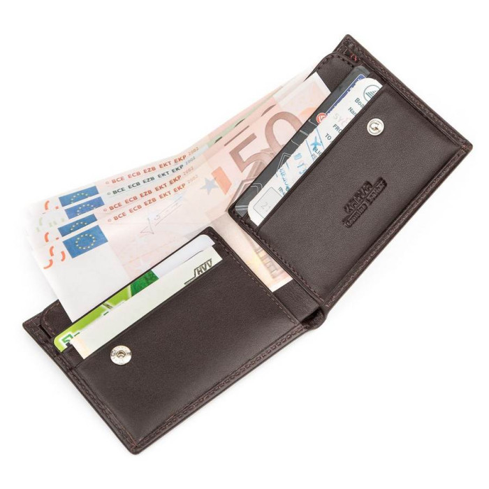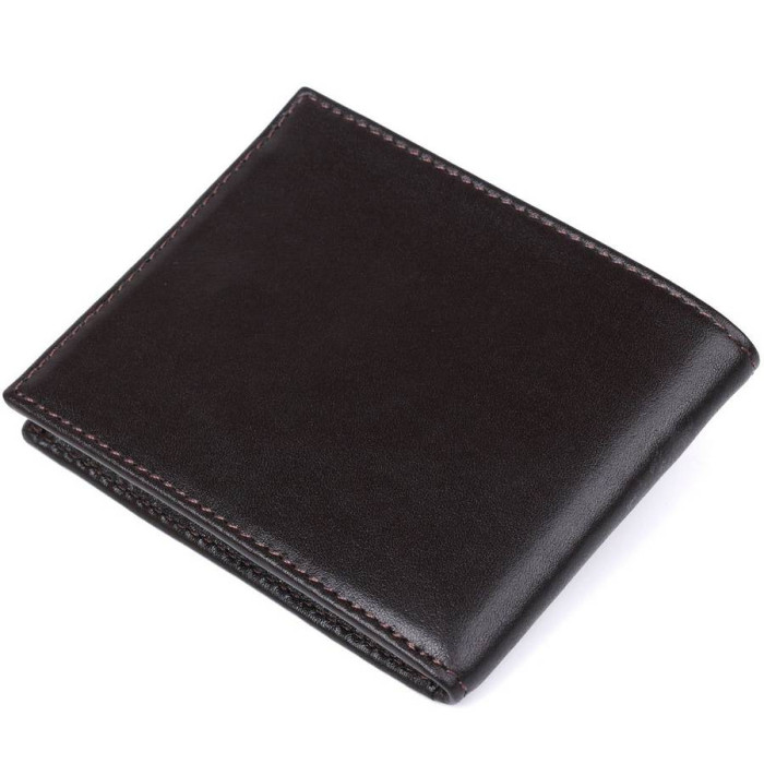 Компактний чоловічий гаманець, з натуральної зернистої фактурної шкіри. Внутрішнє оздоблення аксесуара - поєднання міцного текстилю і гладкої шкіри. Портмоне дуже компактне, але при цьому практичне.