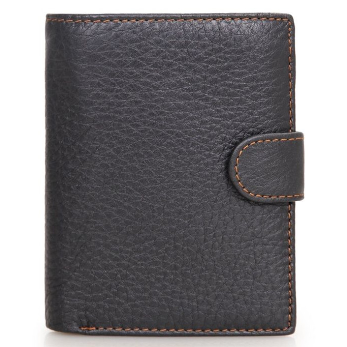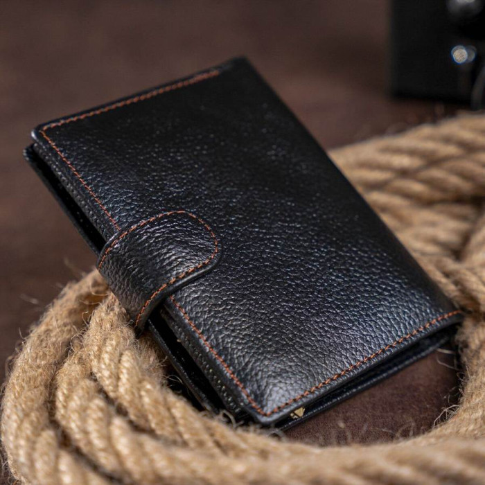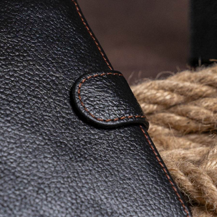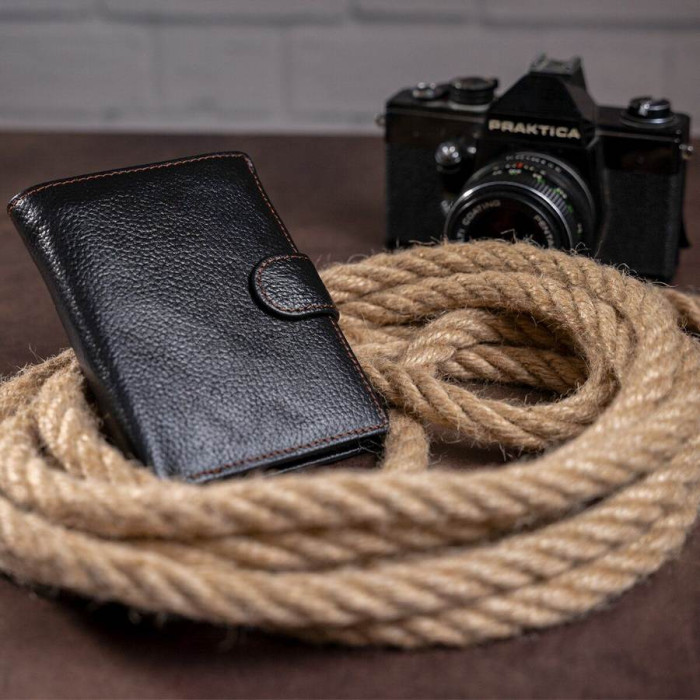 Оригінальний чоловічий гаманець чорного кольору. Аксесуар виконаний з натуральної високоякісної фактурної шкіри приємної на дотик. Гаманець акуратно прошитий світло-коричневою ниткою, що надає йому особливості. Колір фурнітури: латунь. Виріб упаковано в текстильний пилозахисний мішечок білого кольору.
